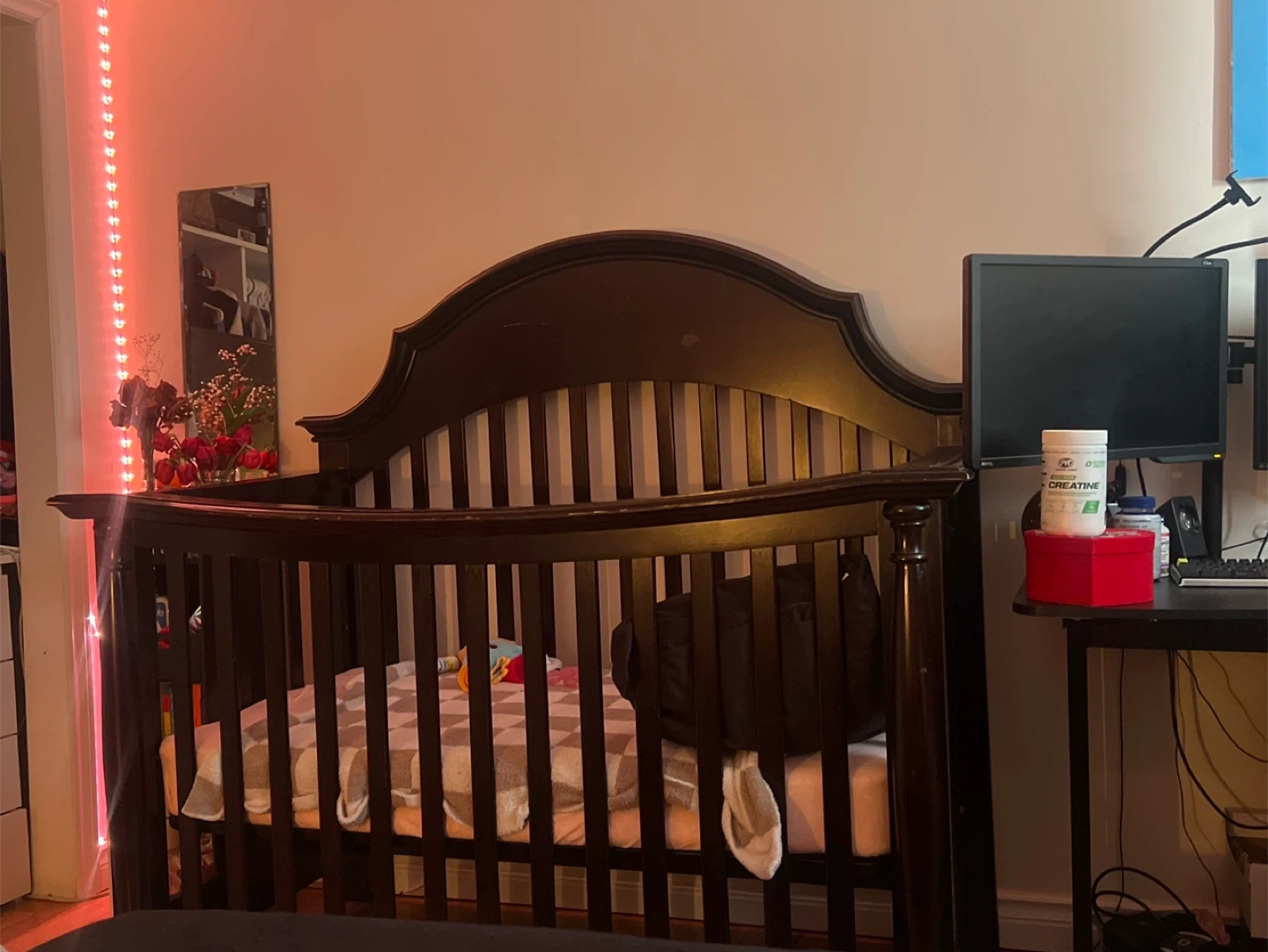 This is a dark wood crib. It's sturdy and has a classic design. It's suitable for a nursery. comes w mattress and brand new mattress pad w new bed sheets
