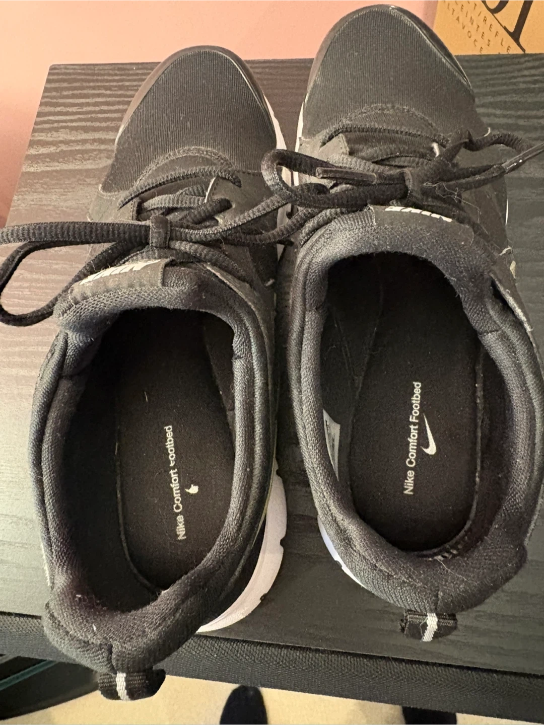 Nike In Season TR2 training shoes for women. These black and gold sneakers feature Nike Comfort Footbed for added cushioning. They're designed for comfortable workouts.