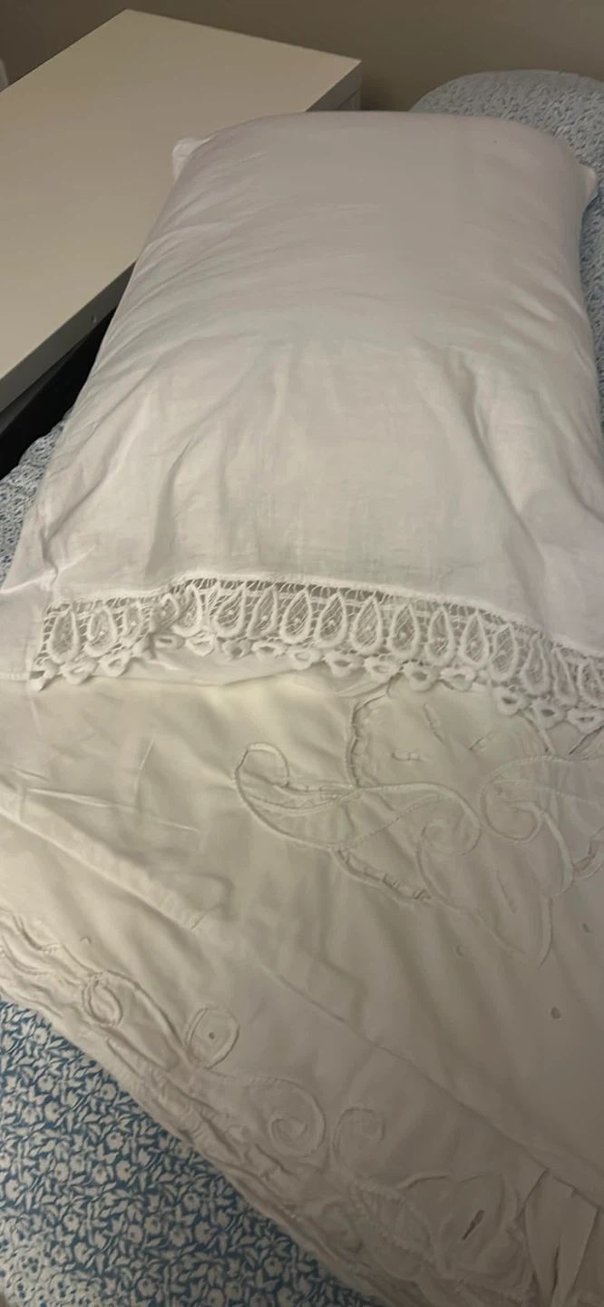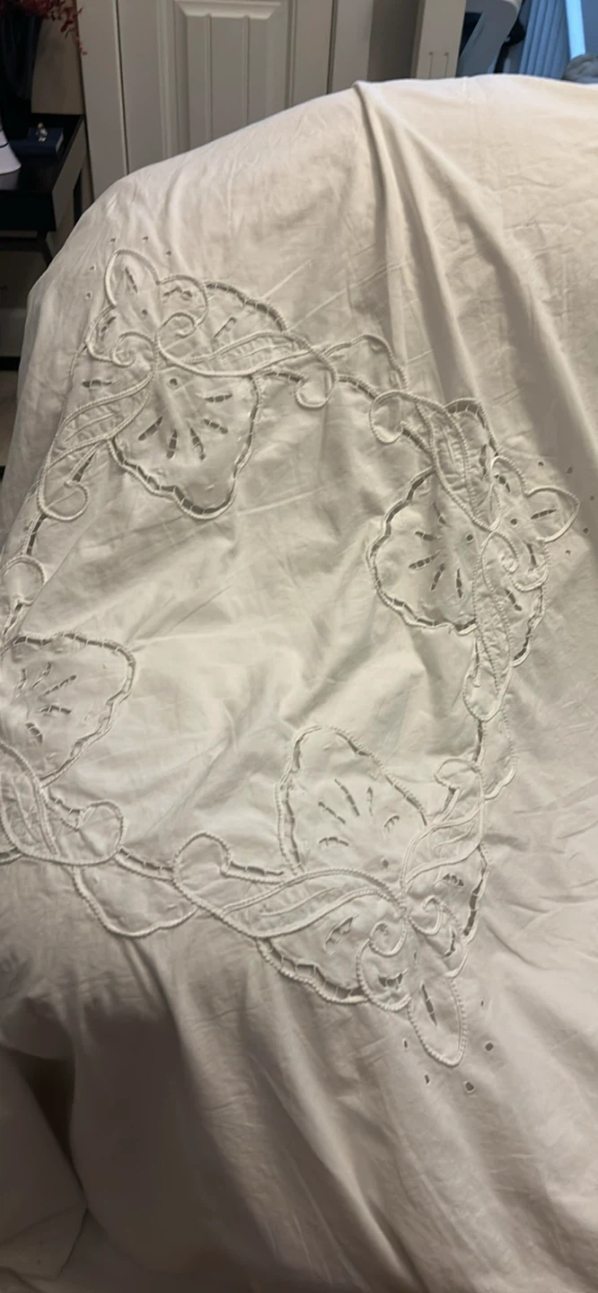 This is a lovely white duvet cover with beautiful embroidery and delicate lace trim. It's made from a comfortable fabric and will add a touch of elegance