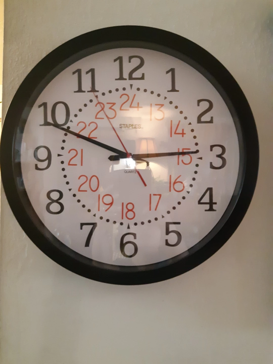 This is a Staples wall clock with a black frame. It's a quartz clock and measures 14 inches in diameter. The dial shows both 12-hour and 24-hour time formats, making it handy for tracking different schedules. It's great for a home office or classroom!