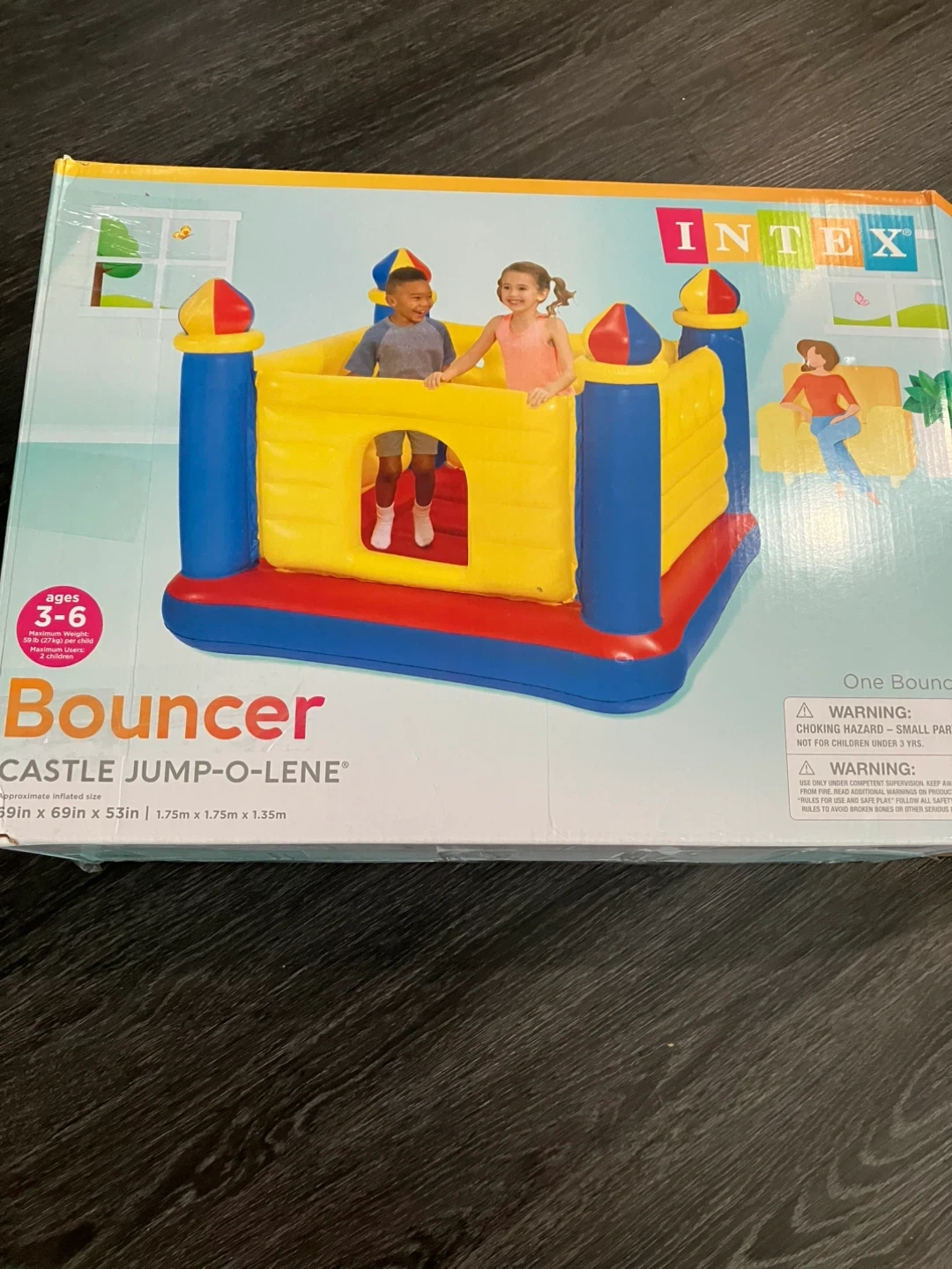 This Intex Castle Jump-O-Lene bouncer is great for kids aged 3-6. It has an approximate inflated size of 69in x 69in x 53in. Maximum weight limit is 59 lb (27 kg) per child with a maximum of 2 children.no pump.