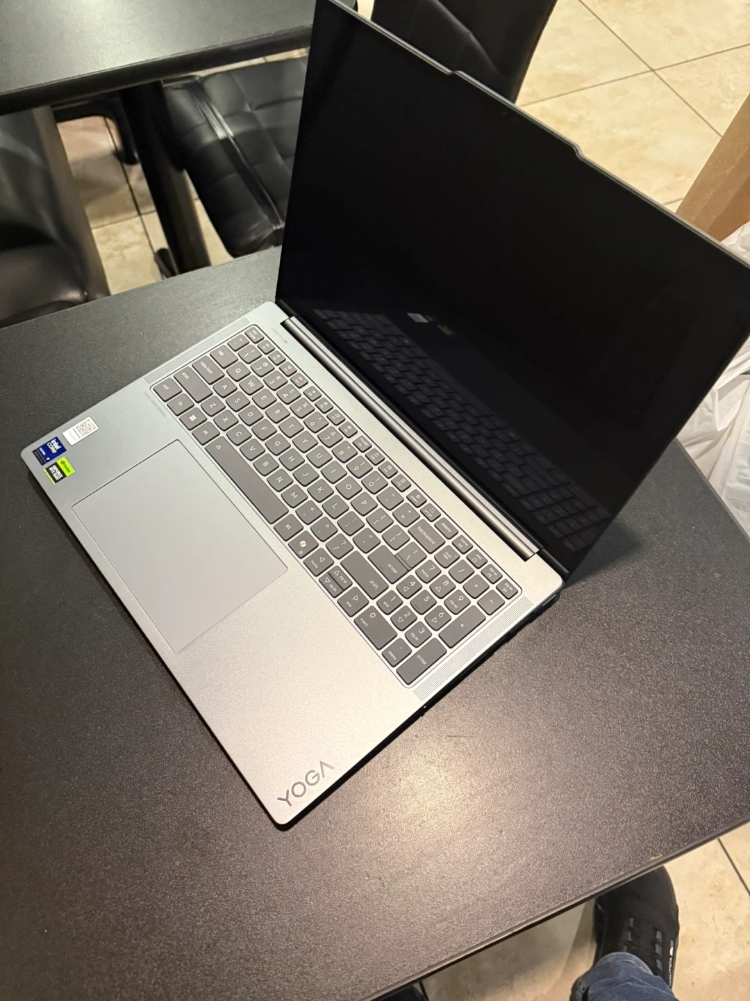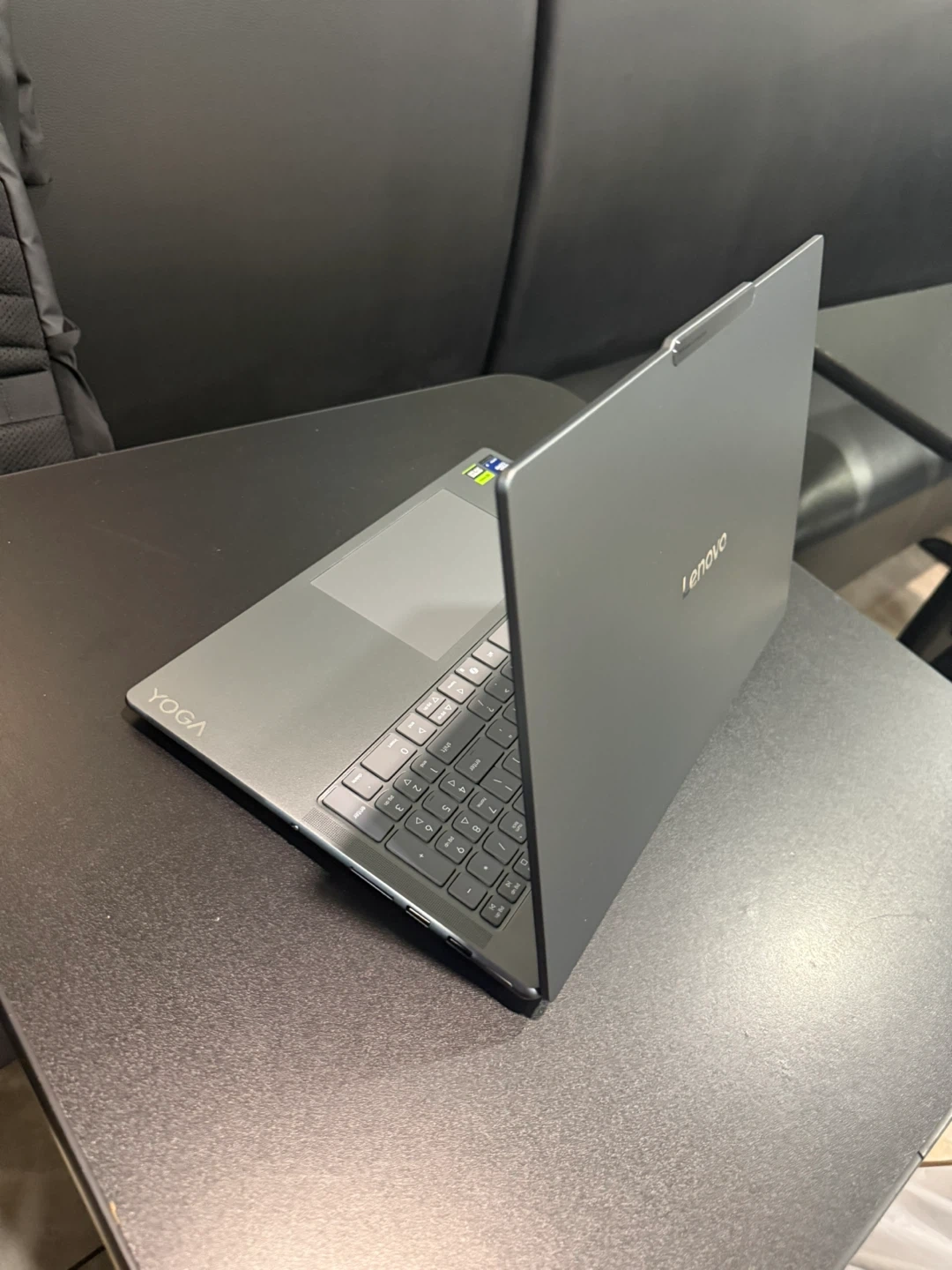 This is a Lenovo Yoga laptop, an Aura Edition model. It's powered by an Intel Core Ultra 9 processor and features an NVIDIA GeForce RTX Studio graphics card. The laptop has a sleek silver design.