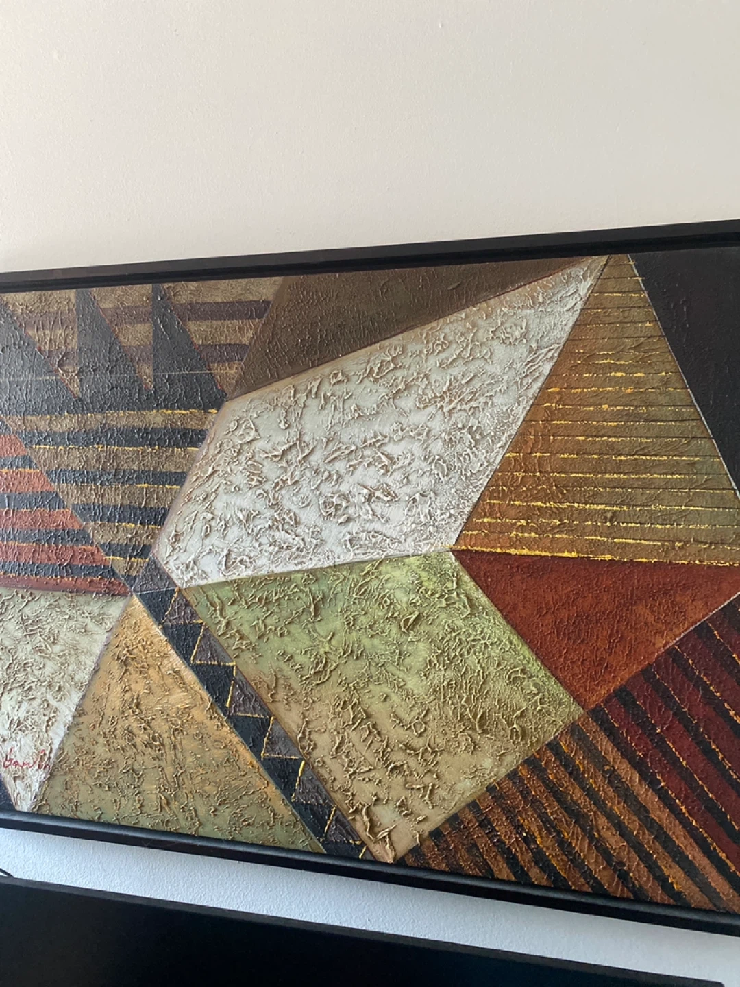 This framed wall art showcases a striking abstract geometric design. Its textured surface and rich earthy tones add depth and character to any room. The artwork is housed in a sleek black frame, ready to hang.