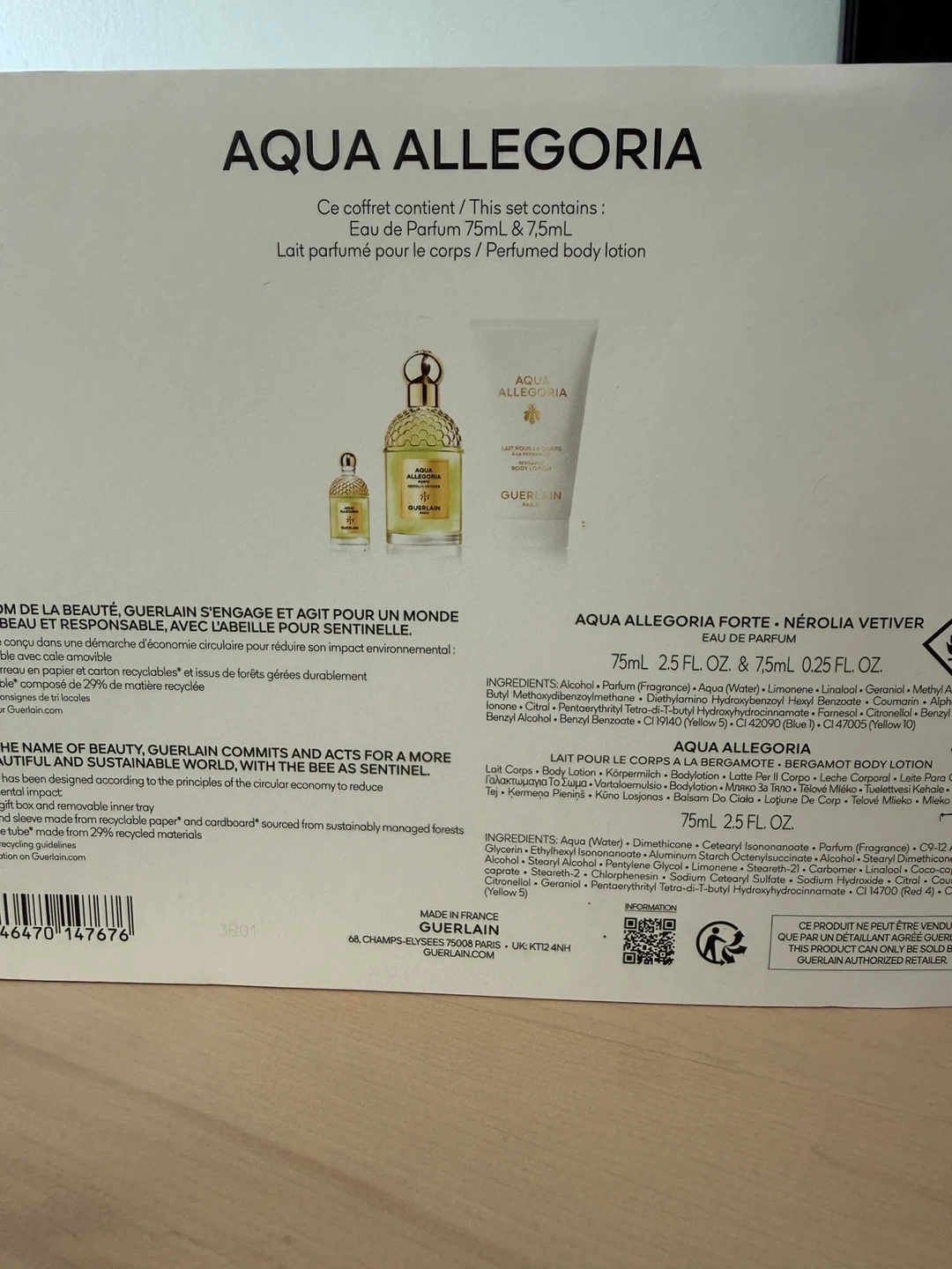 This Guerlain gift box contains Eau de Parfum and perfumed body lotion. The set includes a 75ml bottle of Aqua Allegoria Forte and a 75ml bottle of Aqua Allegoria Neroli Vetiver. It's presented in a gift box with a ribbon.