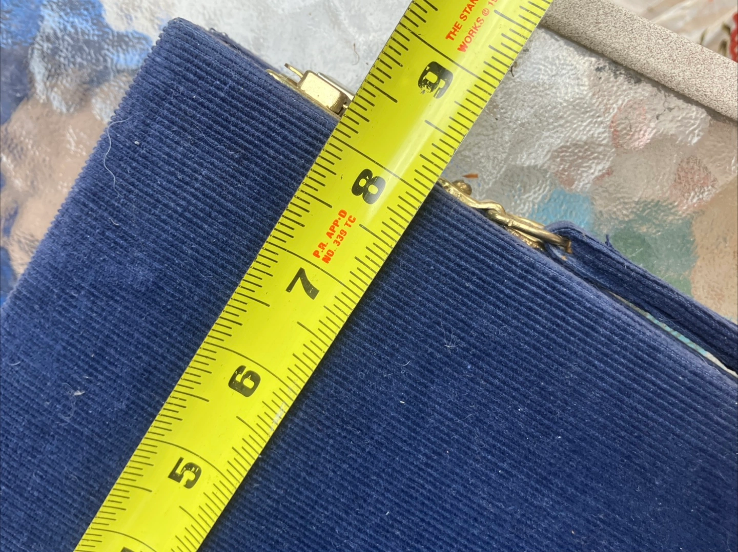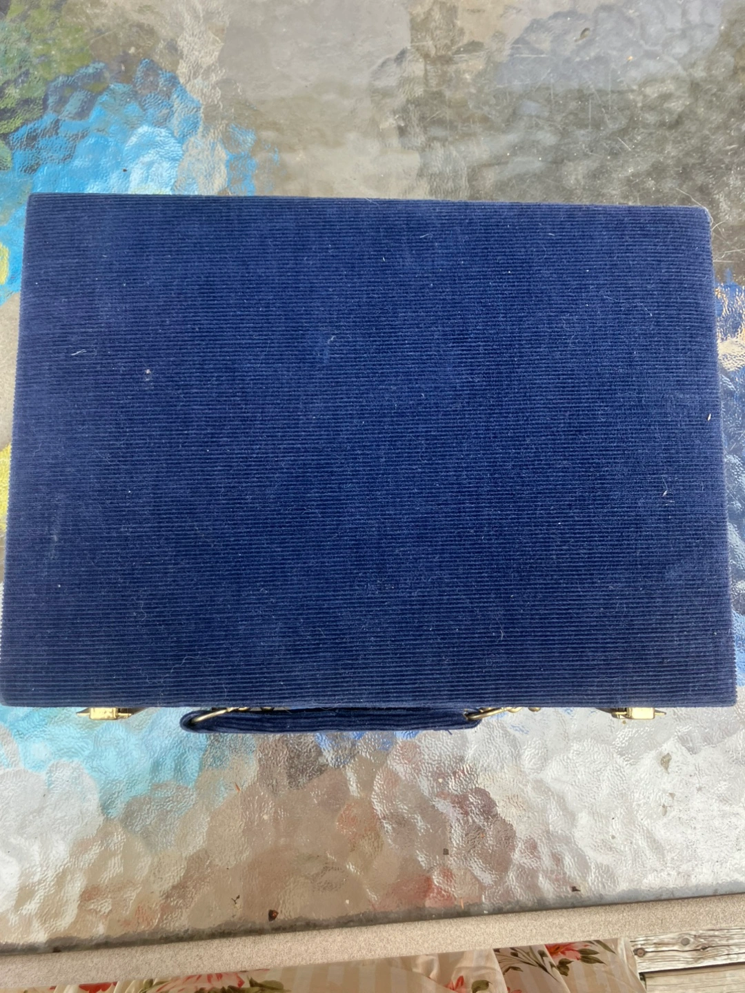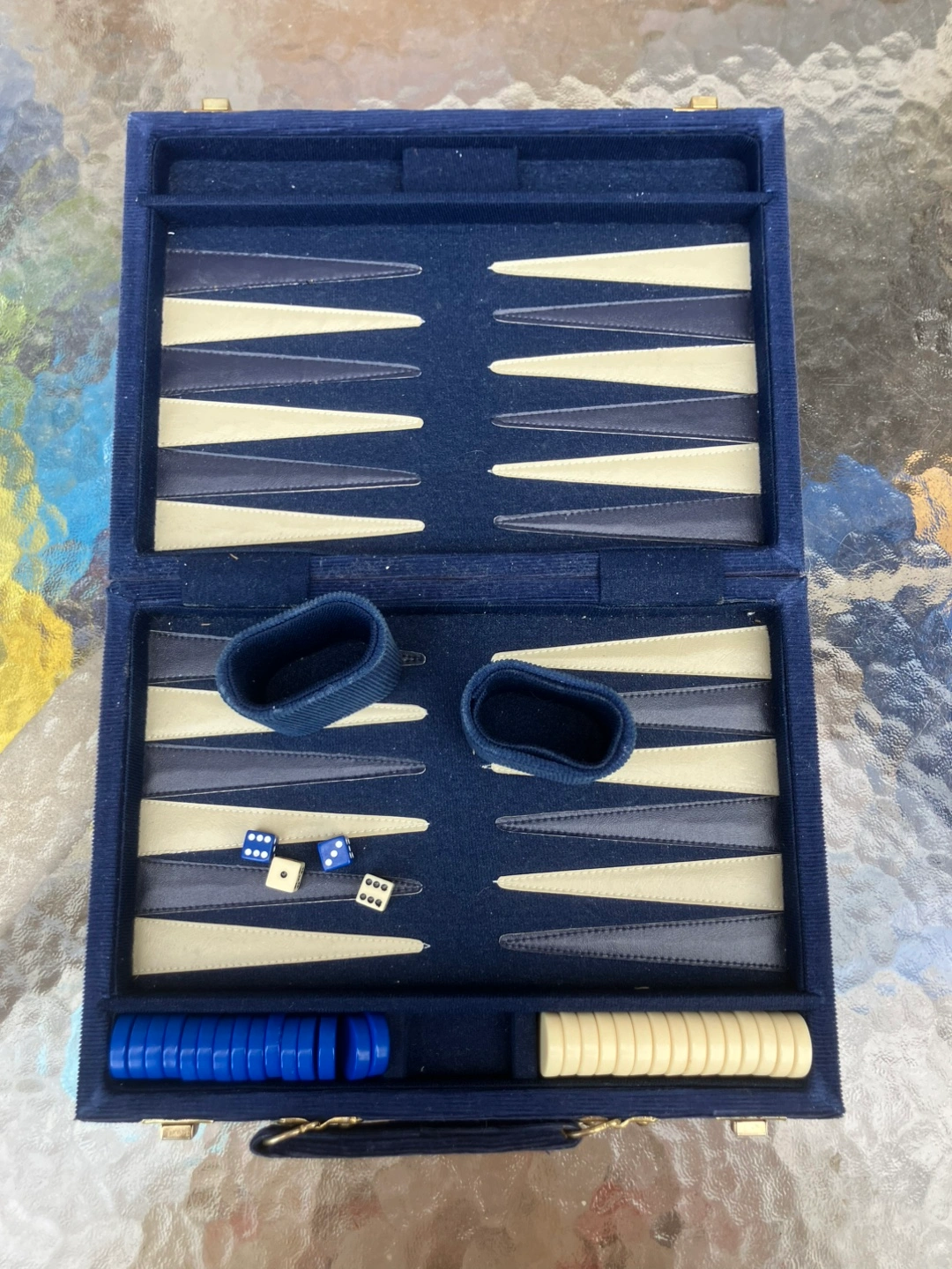 Selling a vintage backgammon set in a lovely blue case. The case measures approximately 12 inches by 8 inches. All pieces are included, and the set is ready for a new home! The box is included, the size is perfect to travel with.