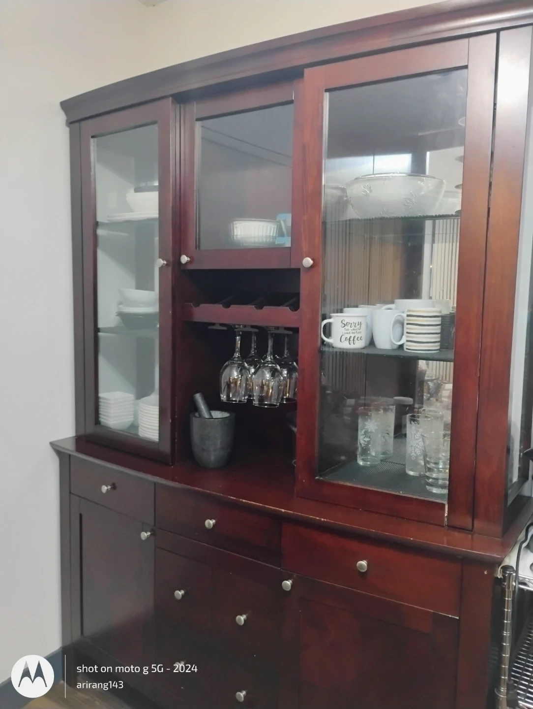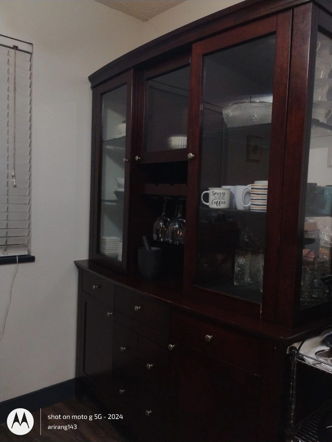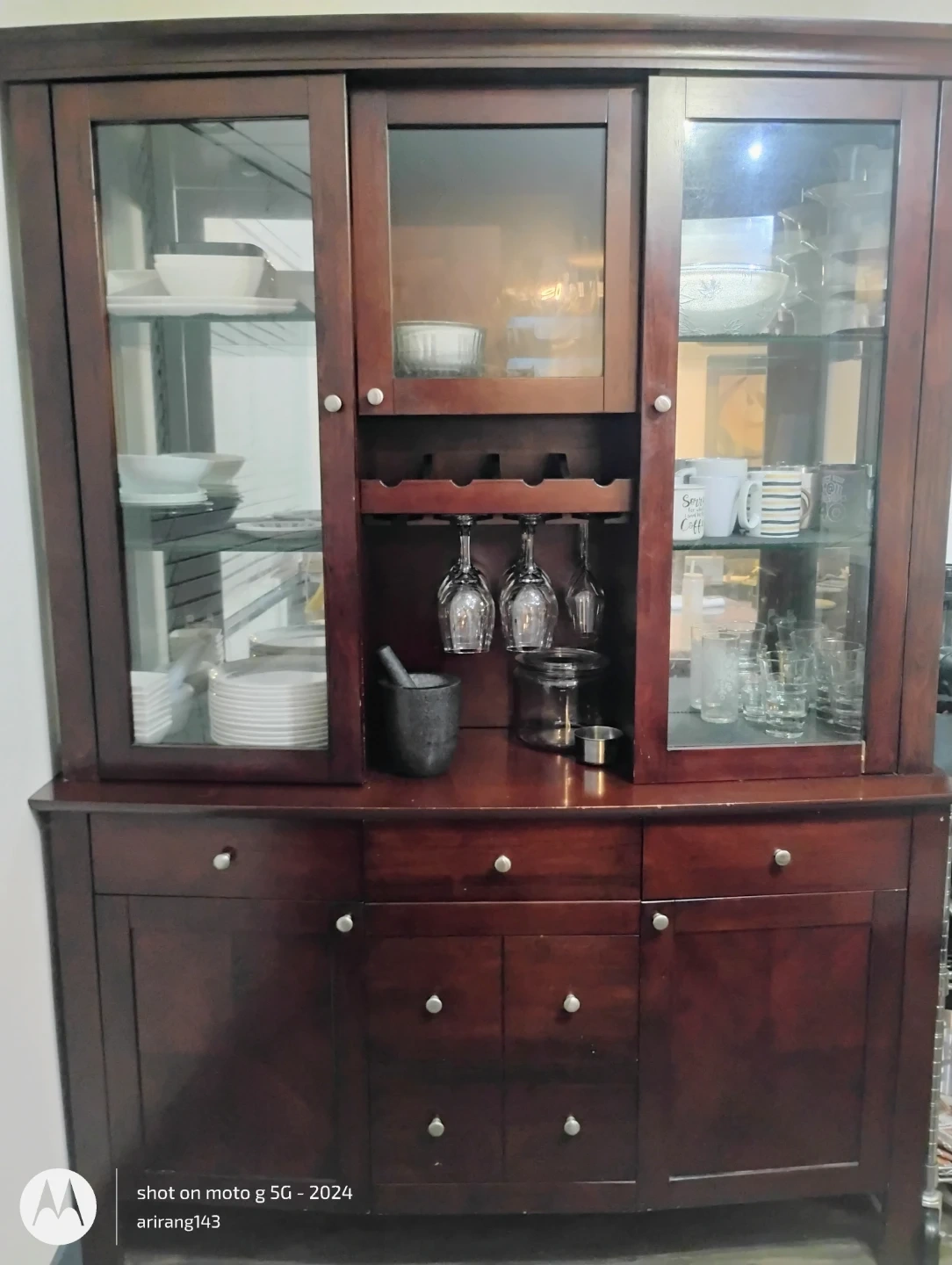 Selling a lovely dark wood china cabinet! It features glass doors on top and drawers below, offering ample storage and display space for your dishes, glassware, and other treasures. It also has a built-in wine rack and stemware holders, perfect for entertaining. Pick up only, Cloverdale, Surrey.