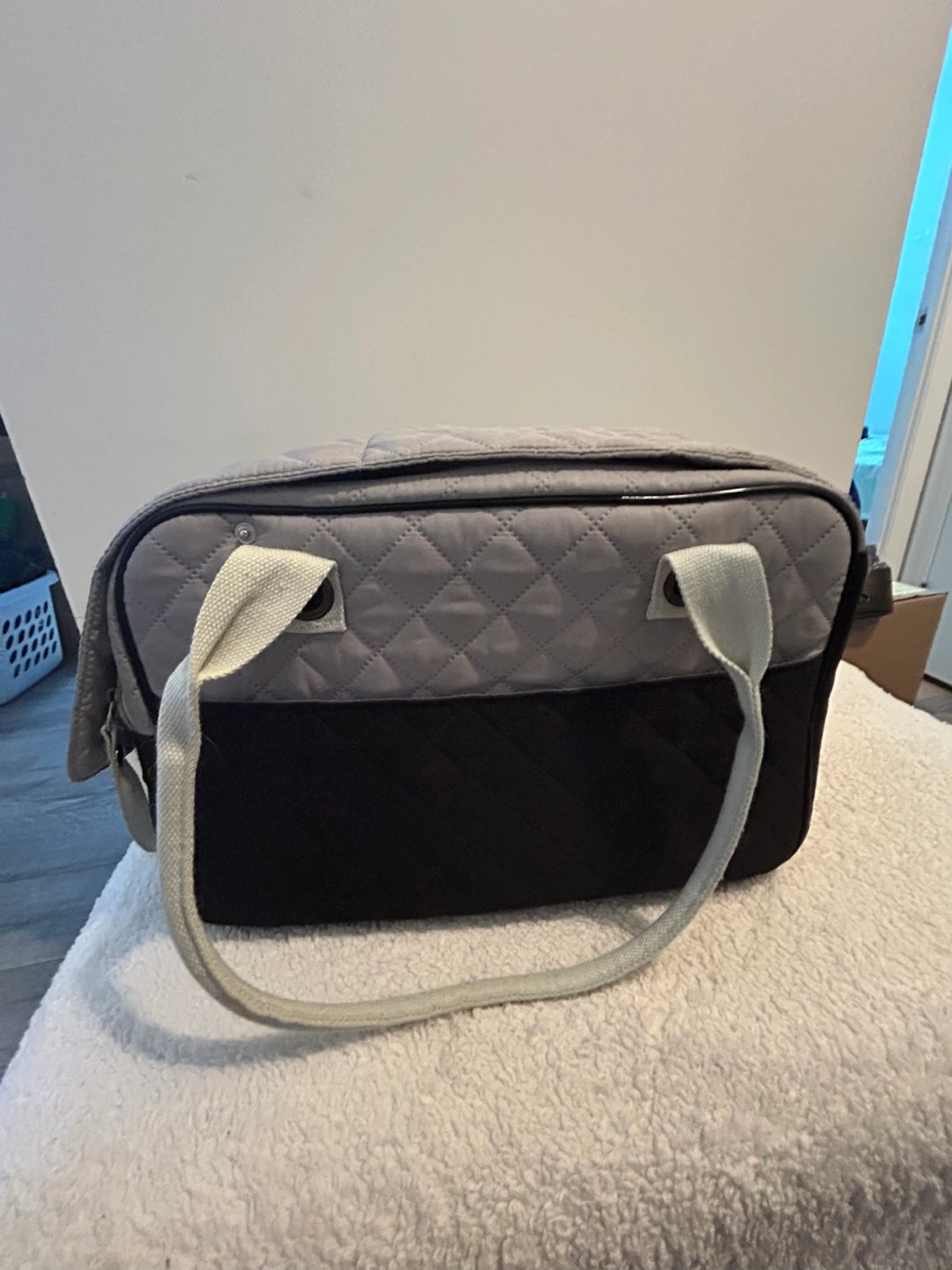 The carrier is gray and black. Features a zippered top. There are handles and an adjustable shoulder strap. It has a mesh opening. It makes for a great way to keep your pet safe and secure during travel.