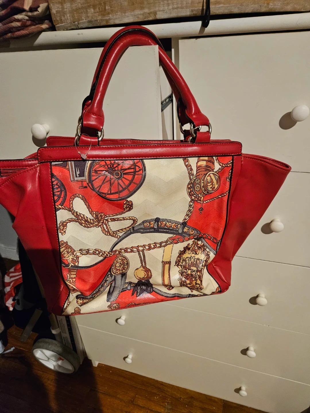Red Tote Handbag with Chain and Horse Print