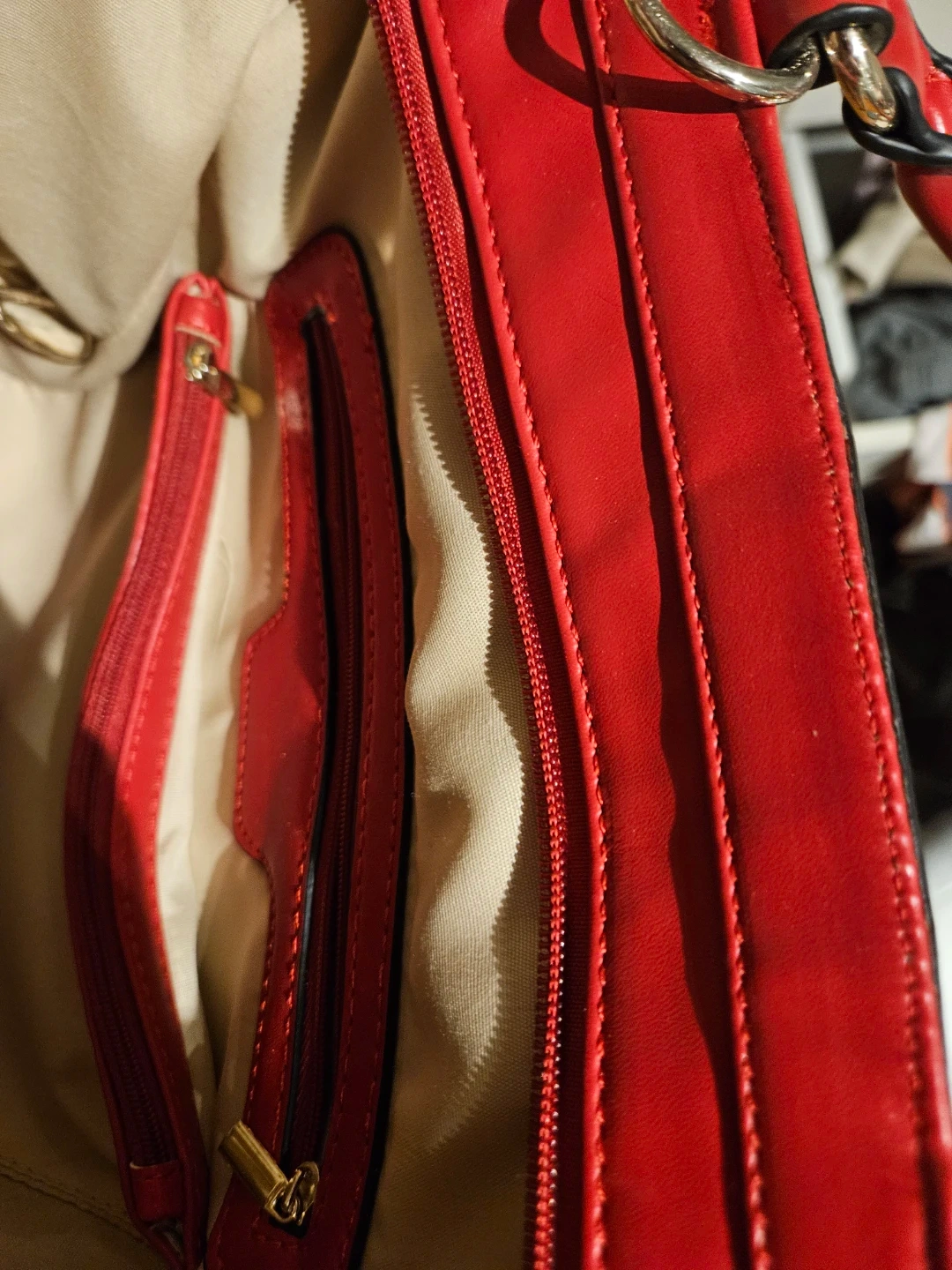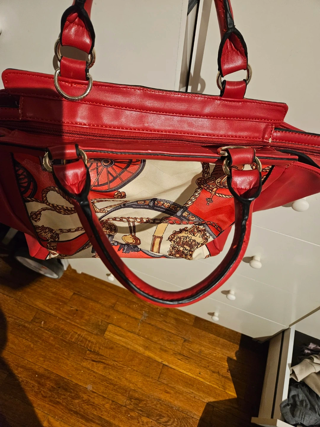 This red tote handbag features a bold print with chains and horse motifs on the front. It's made of faux leather and has a lined interior with multiple pockets, including zippered compartments. The top has a zip closure and dual carry handles.
