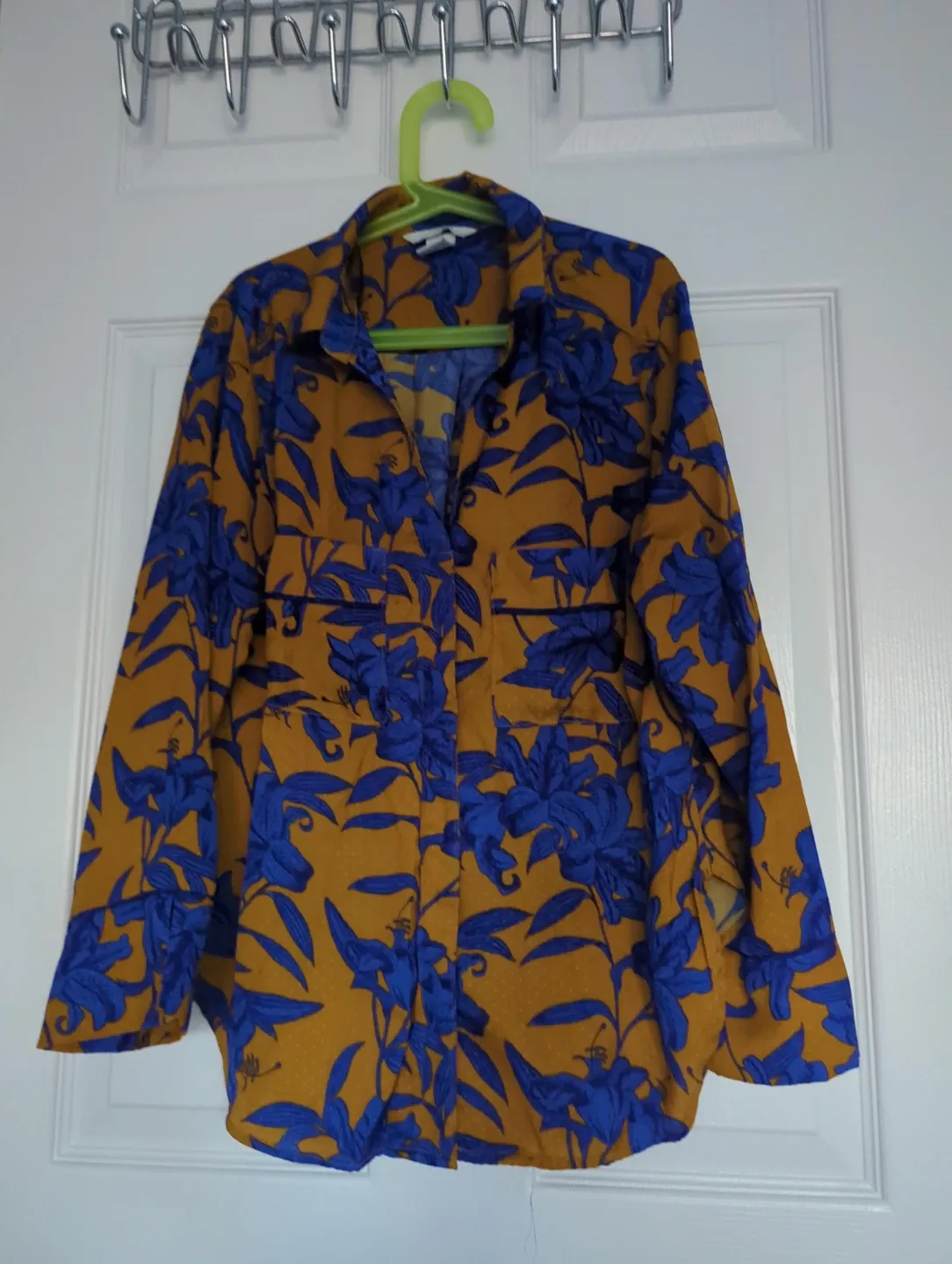 This long-sleeved shirt features a striking blue floral print on a mustard yellow background. It has a classic button-up front and two chest pockets. Made from a lightweight fabric, it's perfect for layering or wearing on its own.