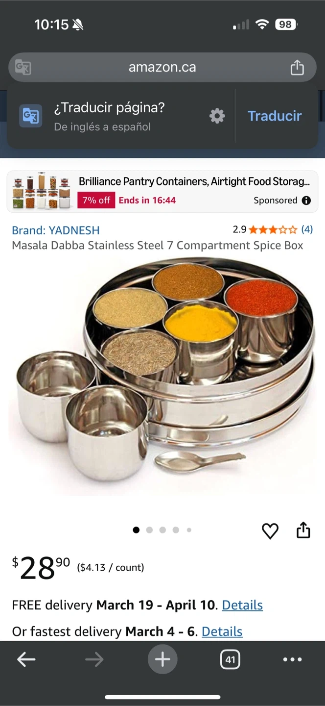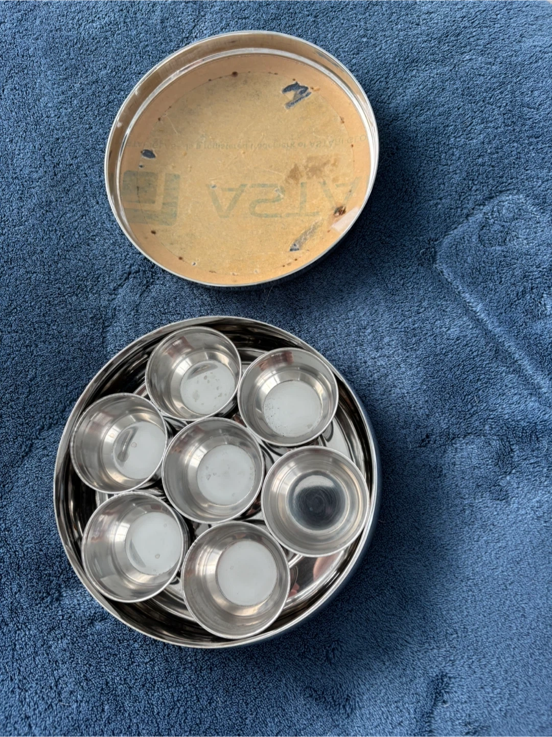 This is a stainless steel spice box with 7 individual compartments. It comes with a fitted lid to keep spices fresh. Ideal for organizing and storing various spices in your kitchen.