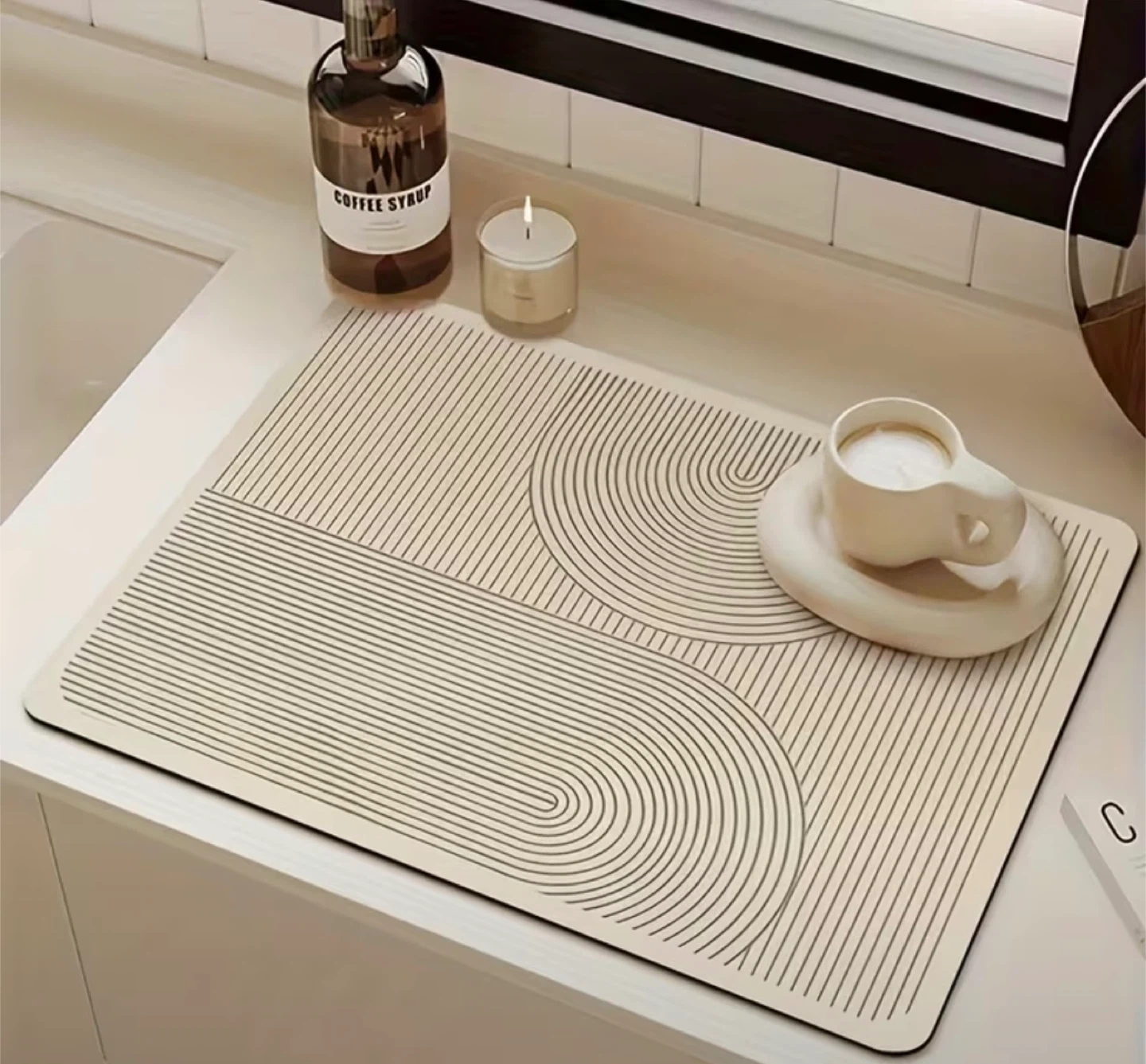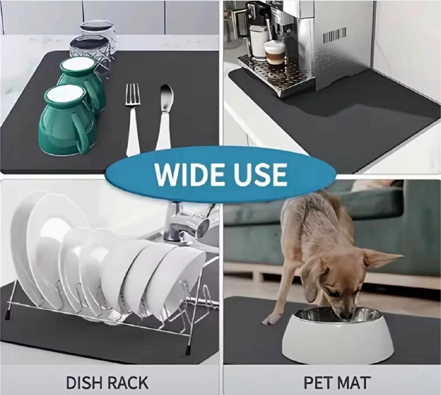 This drying mat is made from quality leather materials, offering easy cleaning and quick drying. It's designed to hide water stains perfectly and can be cut to fit the size you need. The rubber backing makes the mat grippy so it will not slide around.
