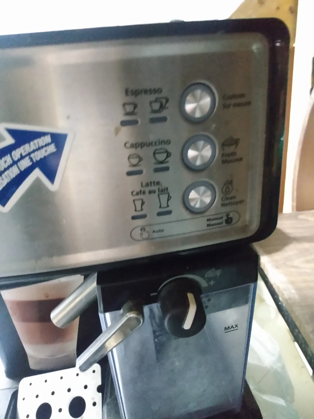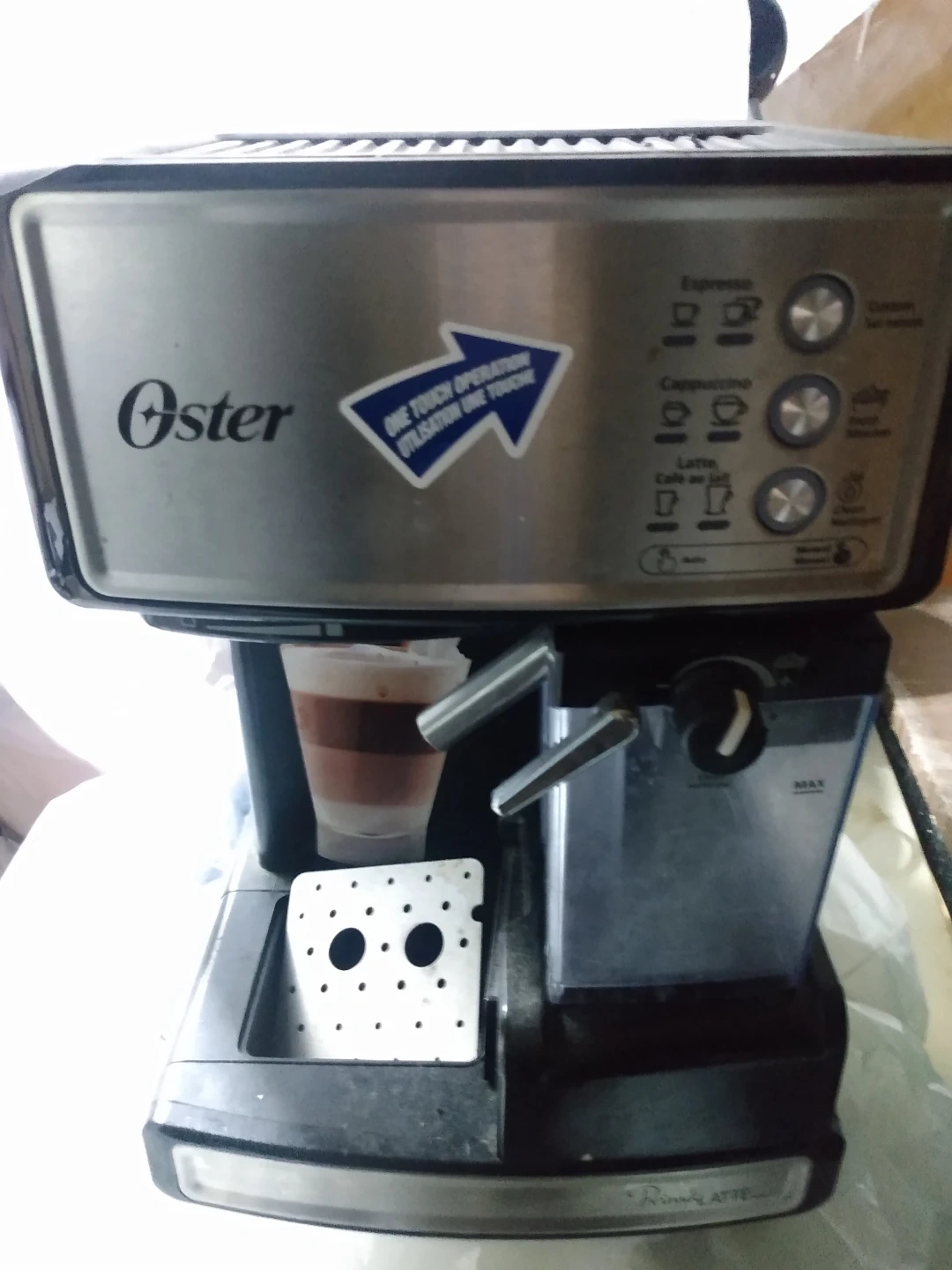 This Oster PrimaLatte machine makes espresso, cappuccino, and latte. It features one-touch operation for convenience. Stainless steel finish.