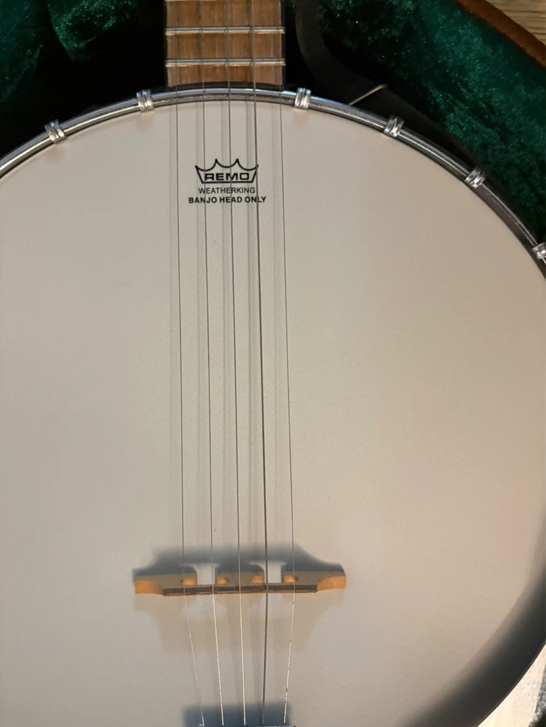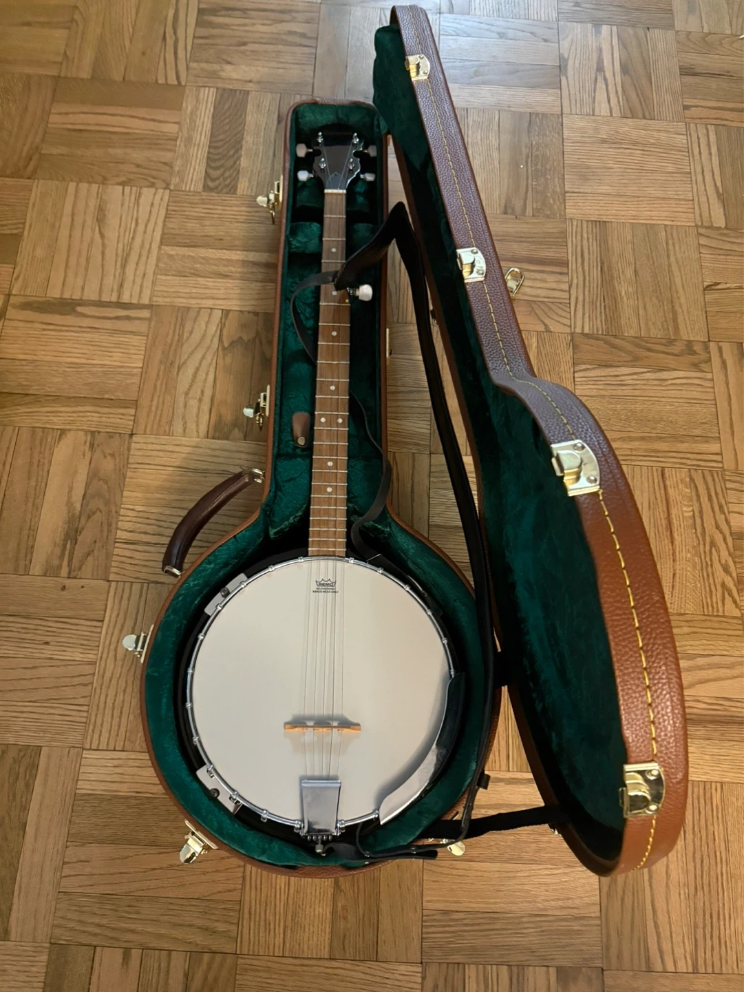 A banjo with a Remo Weatherking head and a hard shell case. Comes with original case lining. This instrument's case includes a built-in strap and small accessory compartment. It's ready for you to play!