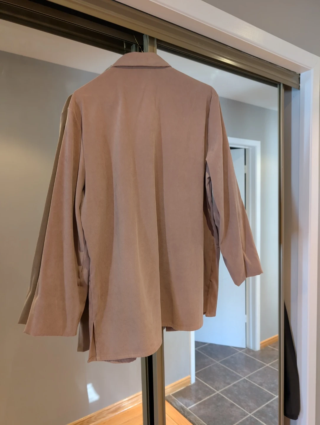 This Wardrobe Essentials jacket is a versatile beige colour. It's made from 97% polyester and 3% spandex for a comfortable fit. The jacket features a button-up front and a classic collar.
