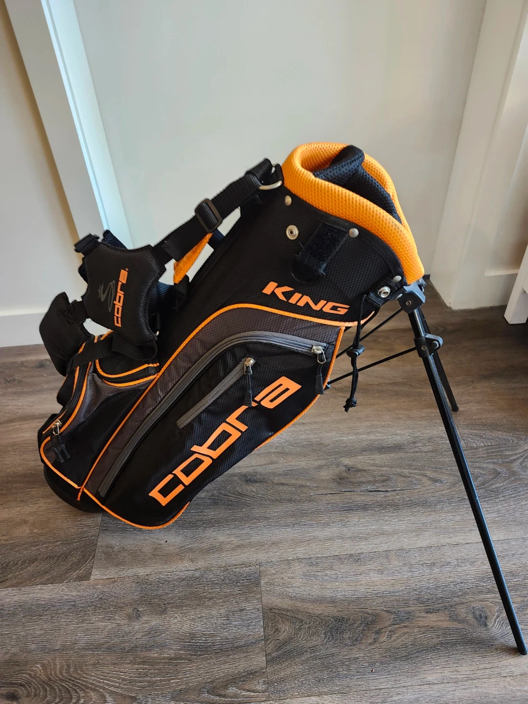 Cobra King stand golf bag. Lightly used and in perfect and clean condition. It's black with orange accents and features a built-in stand. Multiple pockets and a dual strap system are included for convenience.