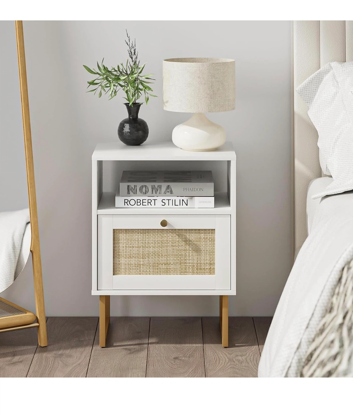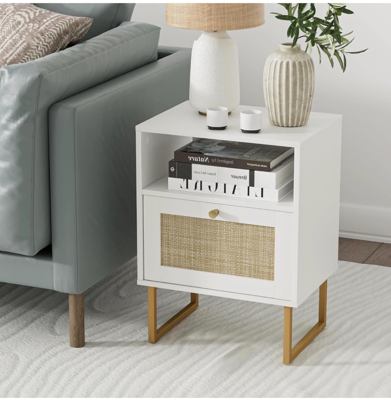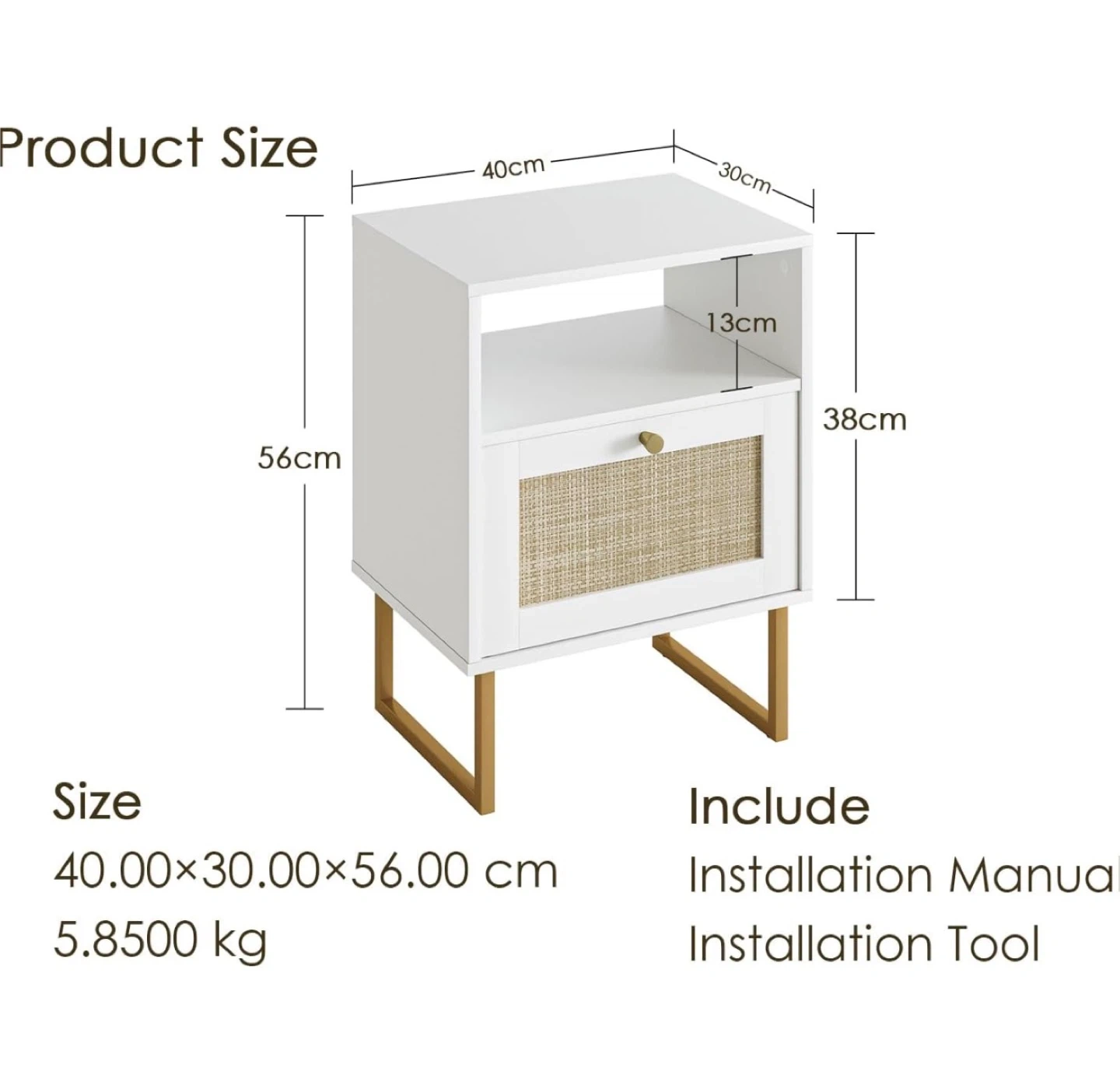 White wood side table with a rattan drawer front and gold metal legs. Features an open shelf and a drawer. Dimensions are 40x30x56cm.