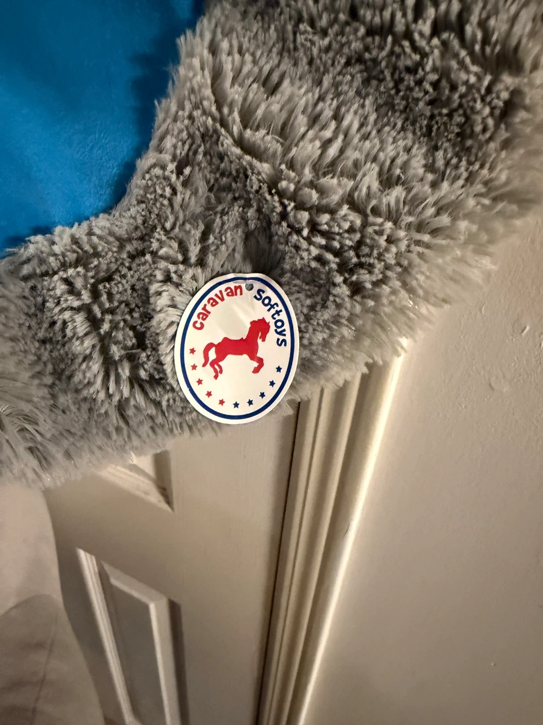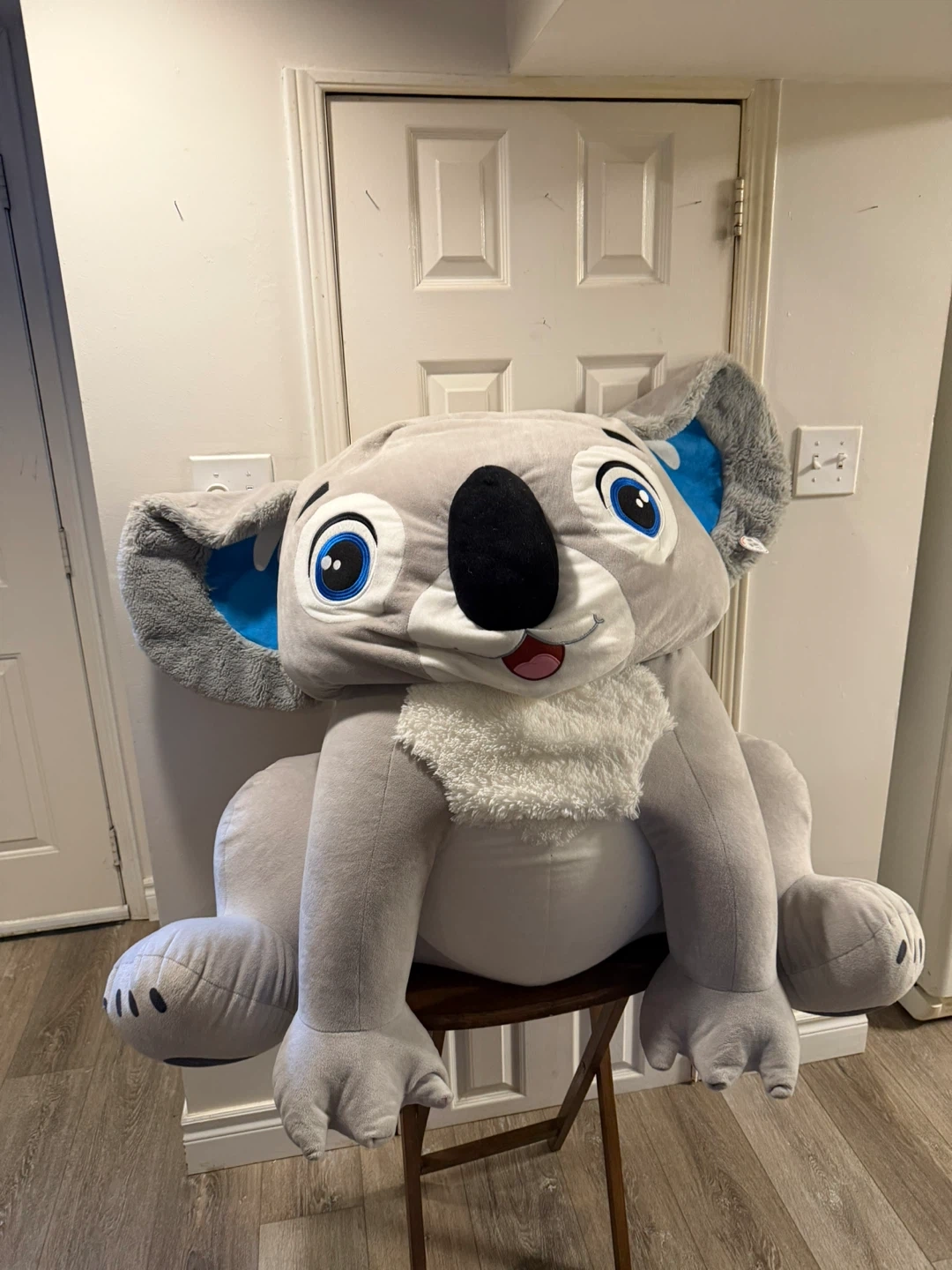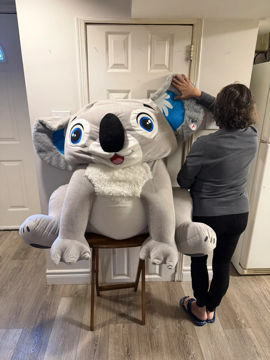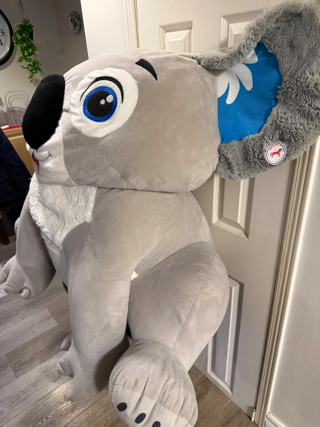 This is a very large plush koala toy named Sebastien from Caravan Softoys. It's made of soft grey material with blue accents on the ears and a fluffy white neck ruff. The toy is quite substantial, perfect for hugs or as a statement piece. Caravan Softoys is a Canadian brand based in Montreal.