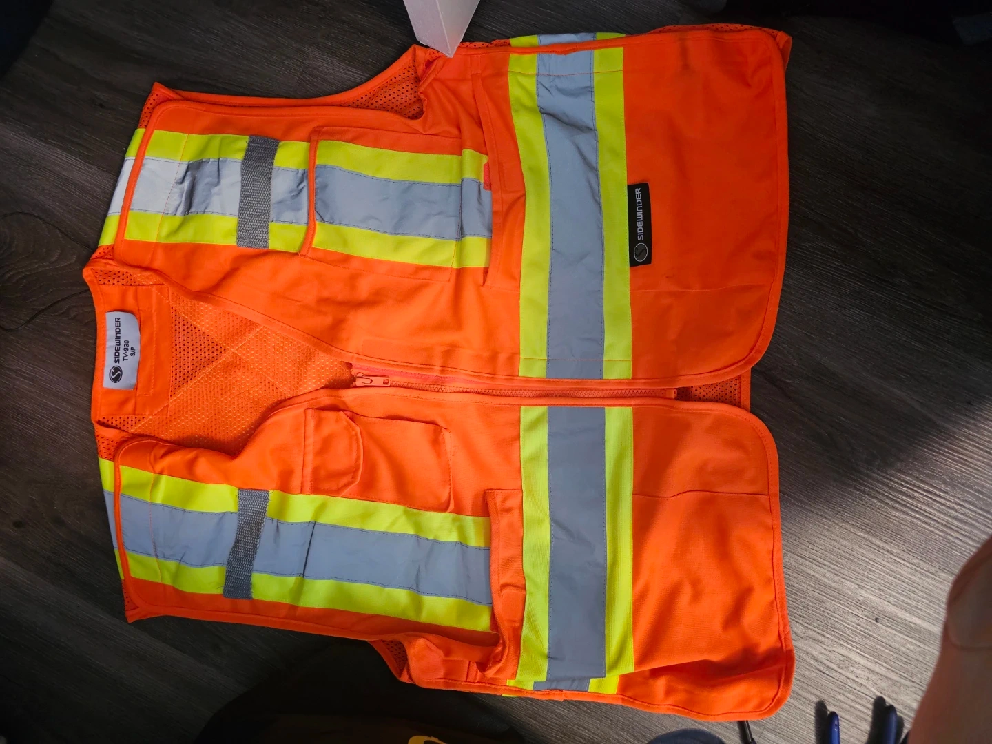 This is a Sidewinder TV-930 safety vest in bright orange. It's a S/P size. The vest has reflective striping for high visibility. It's made of mesh material.