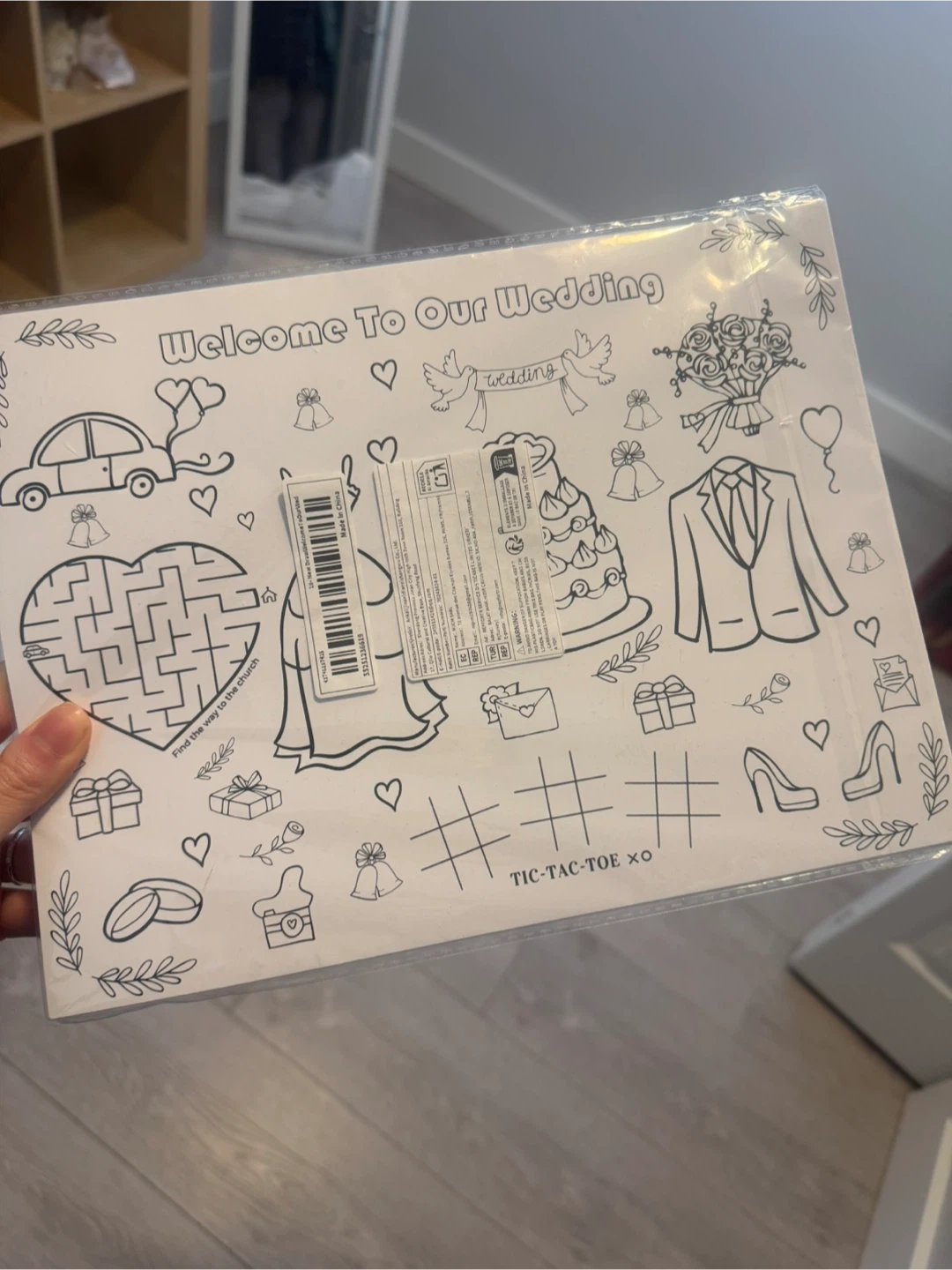 This placemat features fun wedding-themed drawings for kids to colour and games like tic-tac-toe and a maze. It's perfect for keeping young guests entertained during wedding receptions.