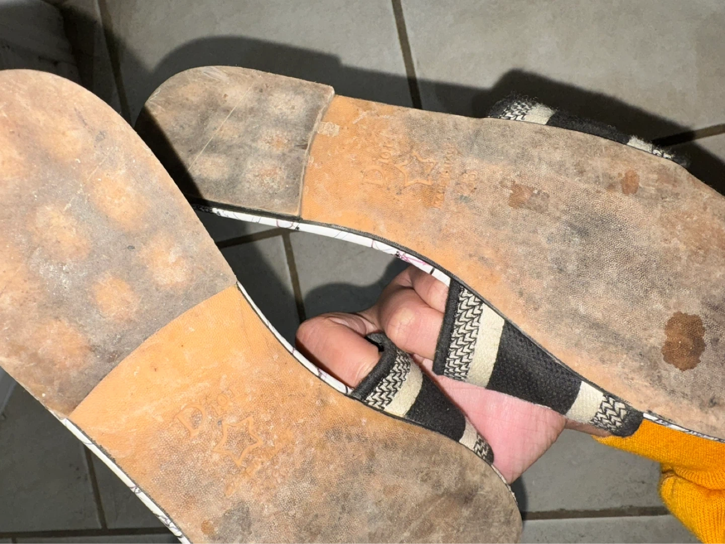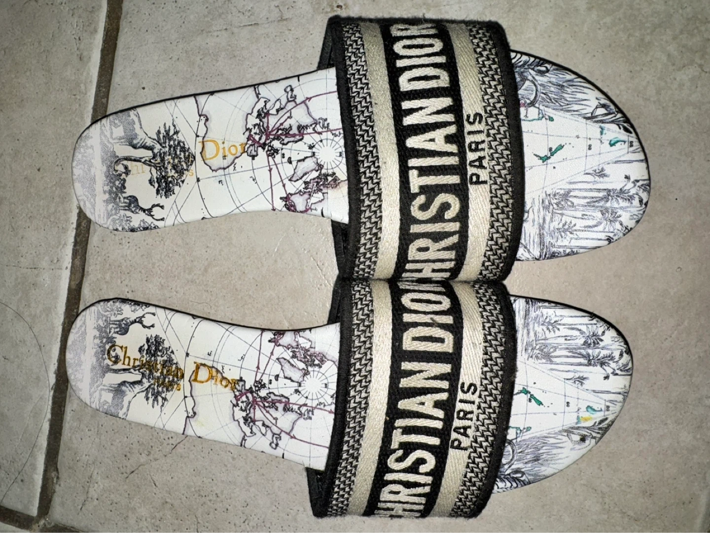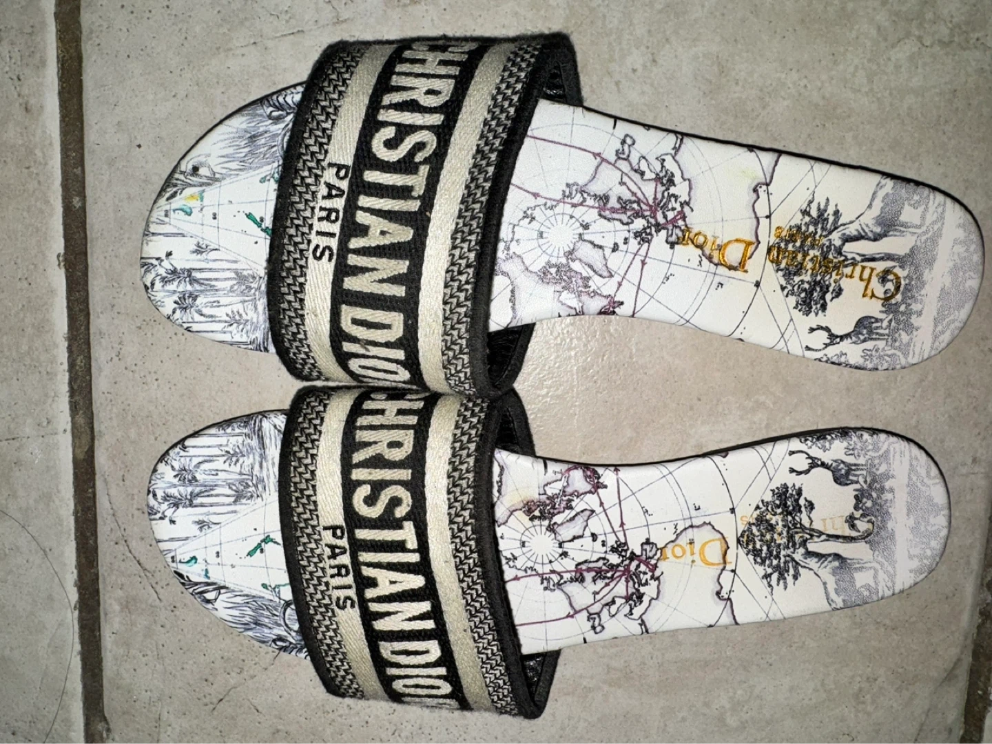 Stylish Christian Dior slides with a map print and signature logo strap. Comfortable and chic for everyday wear.