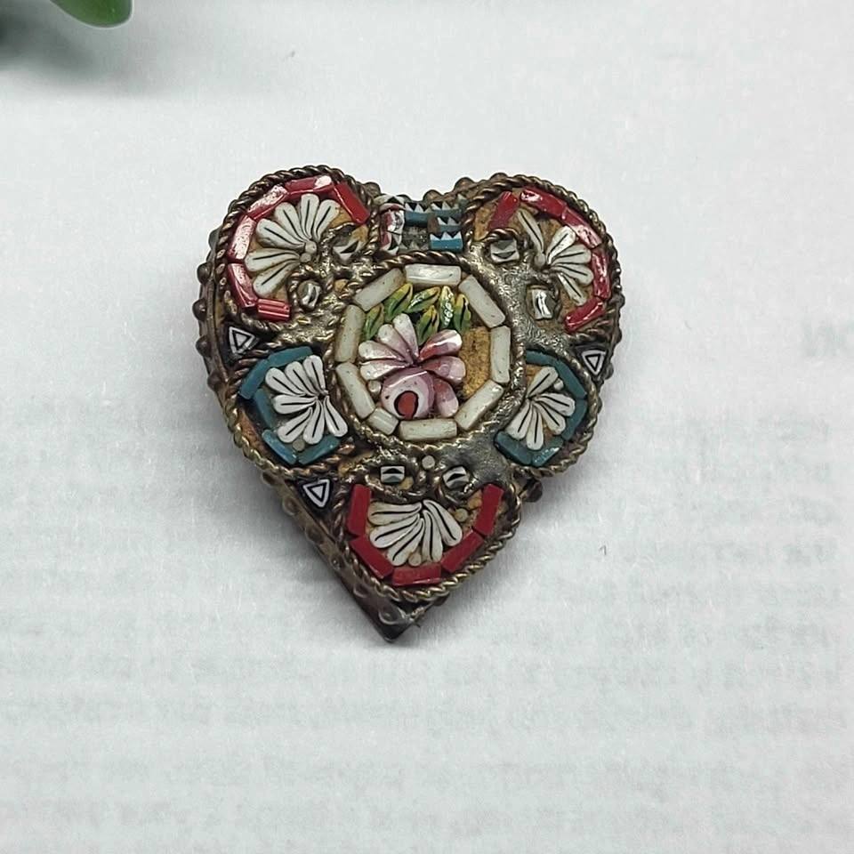 Vintage Millefiori Glass Heart Brooch Italian Micro Mosaic