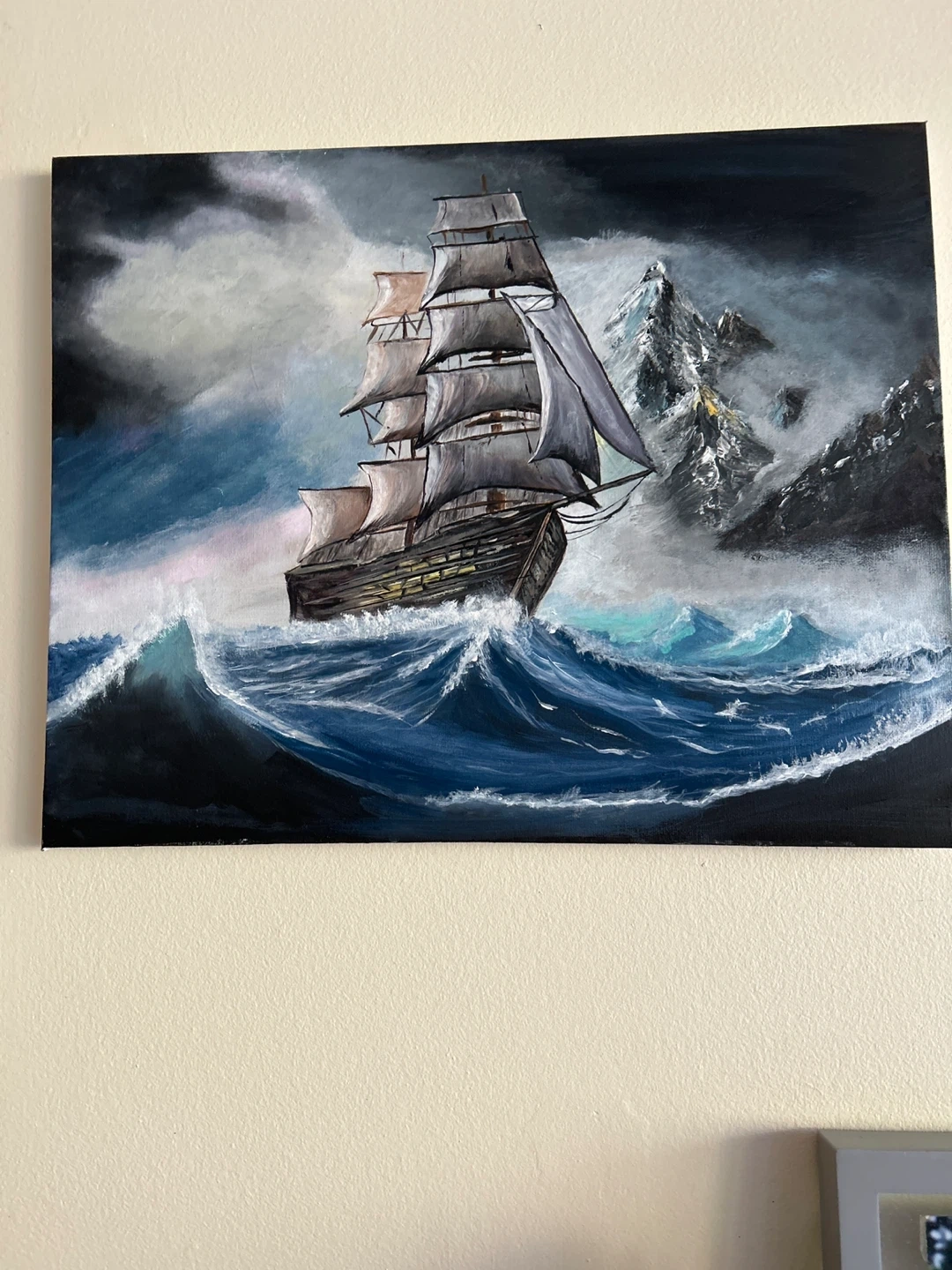 This painting depicts a tall ship battling heavy waves and dark, stormy skies with mountains in the background. It's a dramatic piece that brings a sense of adventure to any room. The artwork is painted on canvas.