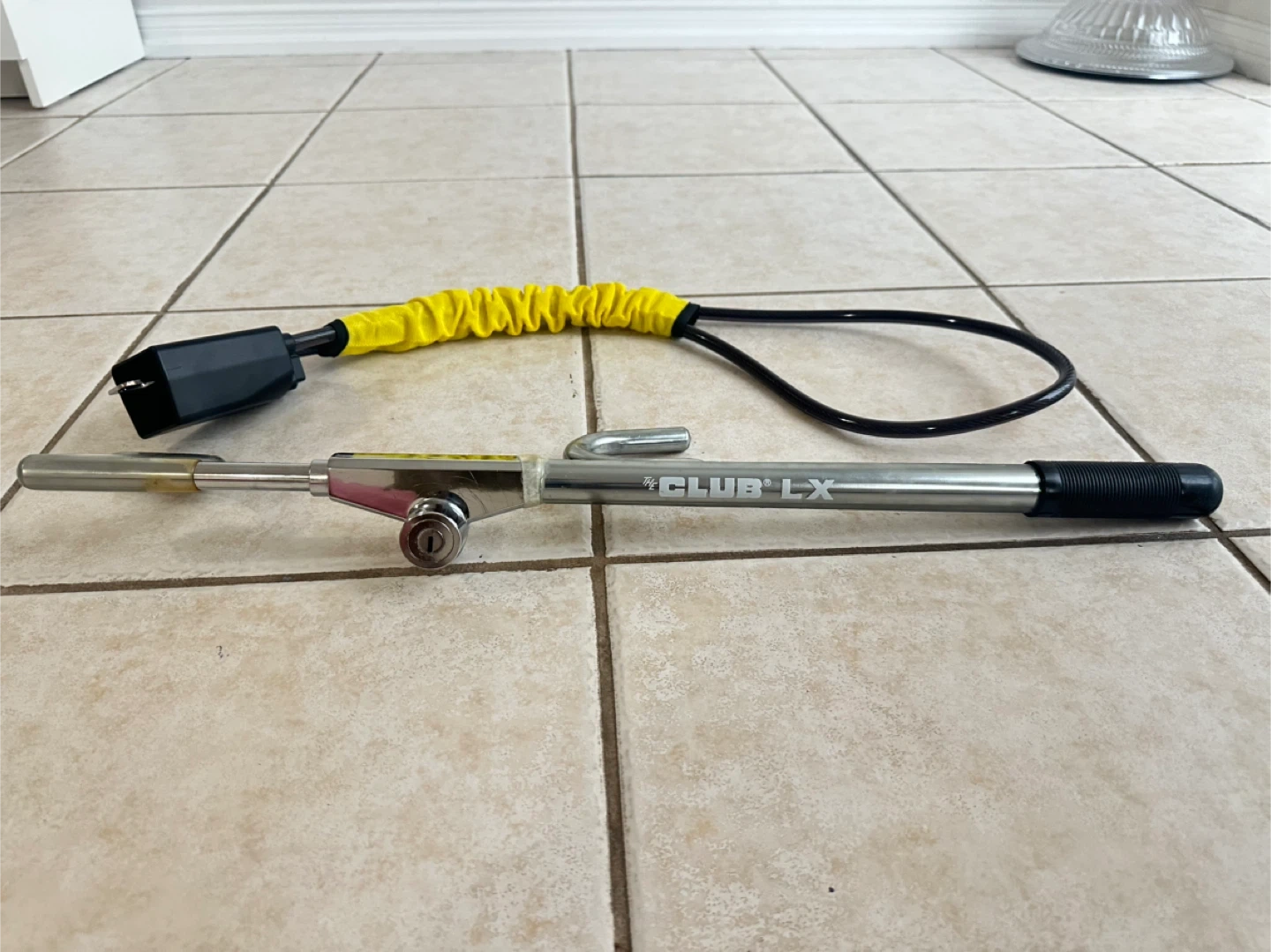 This is The Club LX steering wheel lock. It's a sturdy anti-theft device for your vehicle. This lock is made of metal with a bright yellow protective sleeve and a black rubber grip.