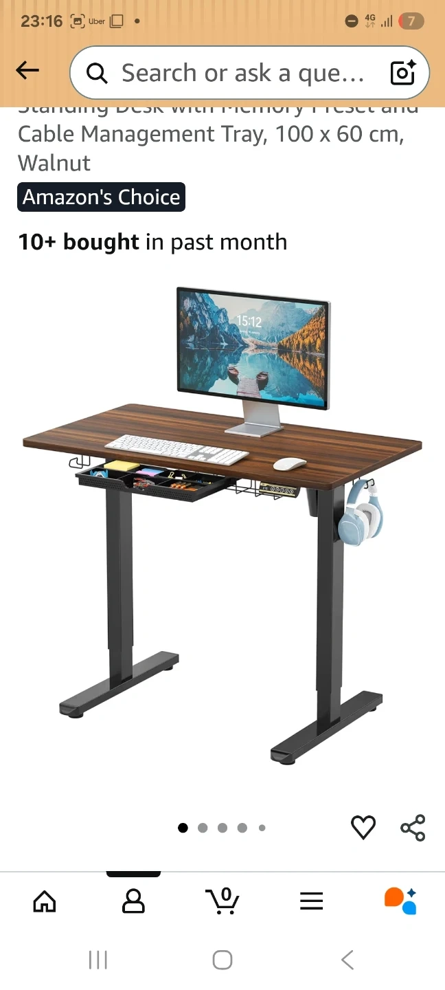 Electric standing desk with a walnut wood grain finish. It features a digital display for height adjustment and memory presets. The desk has a sturdy metal frame with adjustable legs.