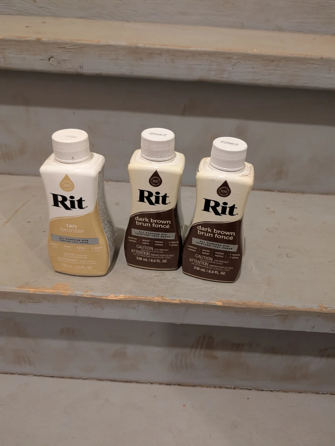 Three bottles of Rit All-Purpose Dye. Includes Tan, and two bottles of Dark Brown. Each bottle is 236 mL or 8.0 fl. oz. Perfect for all your fabric dyeing projects!