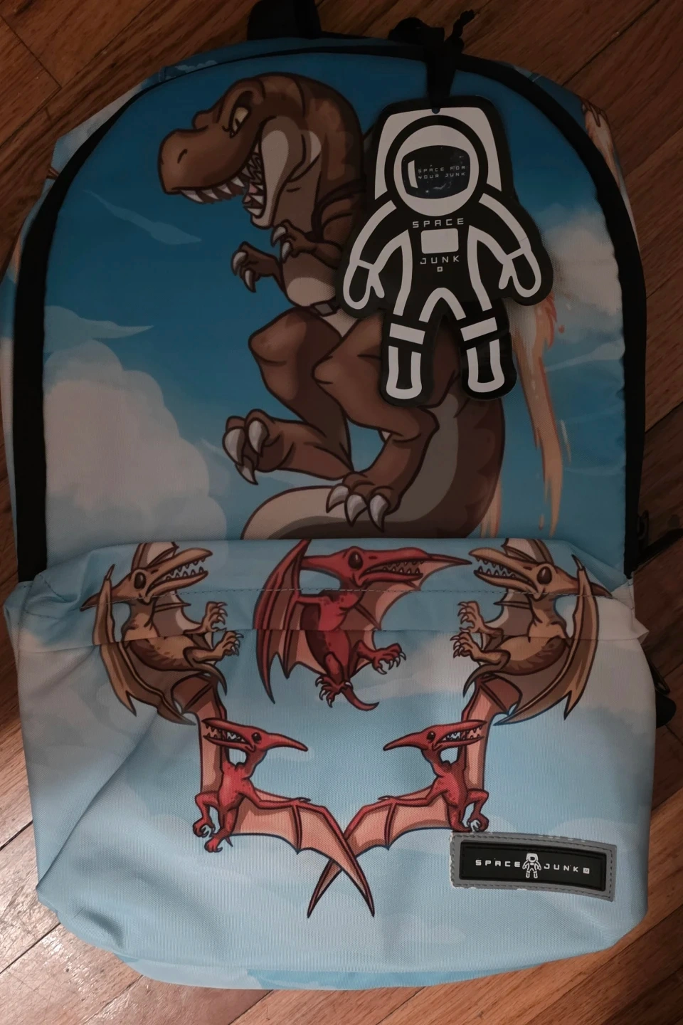 This Space Junk backpack features a fun dinosaur graphic. It's great for kids heading back to school or for carrying essentials. The straps are adjustable for a comfortable fit.