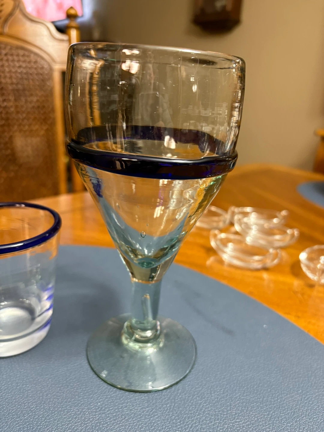 Hand Blown Glassware Set with Blue Rim