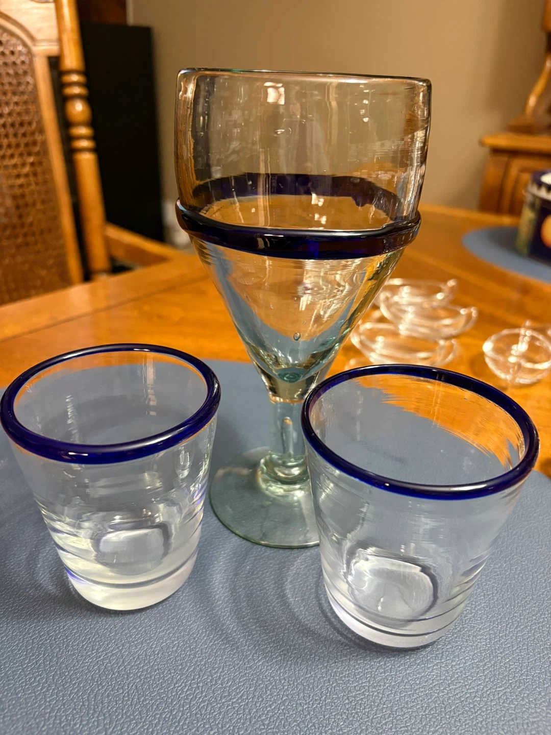 This set includes a wine glass and two tumblers, all featuring a beautiful blue rim.