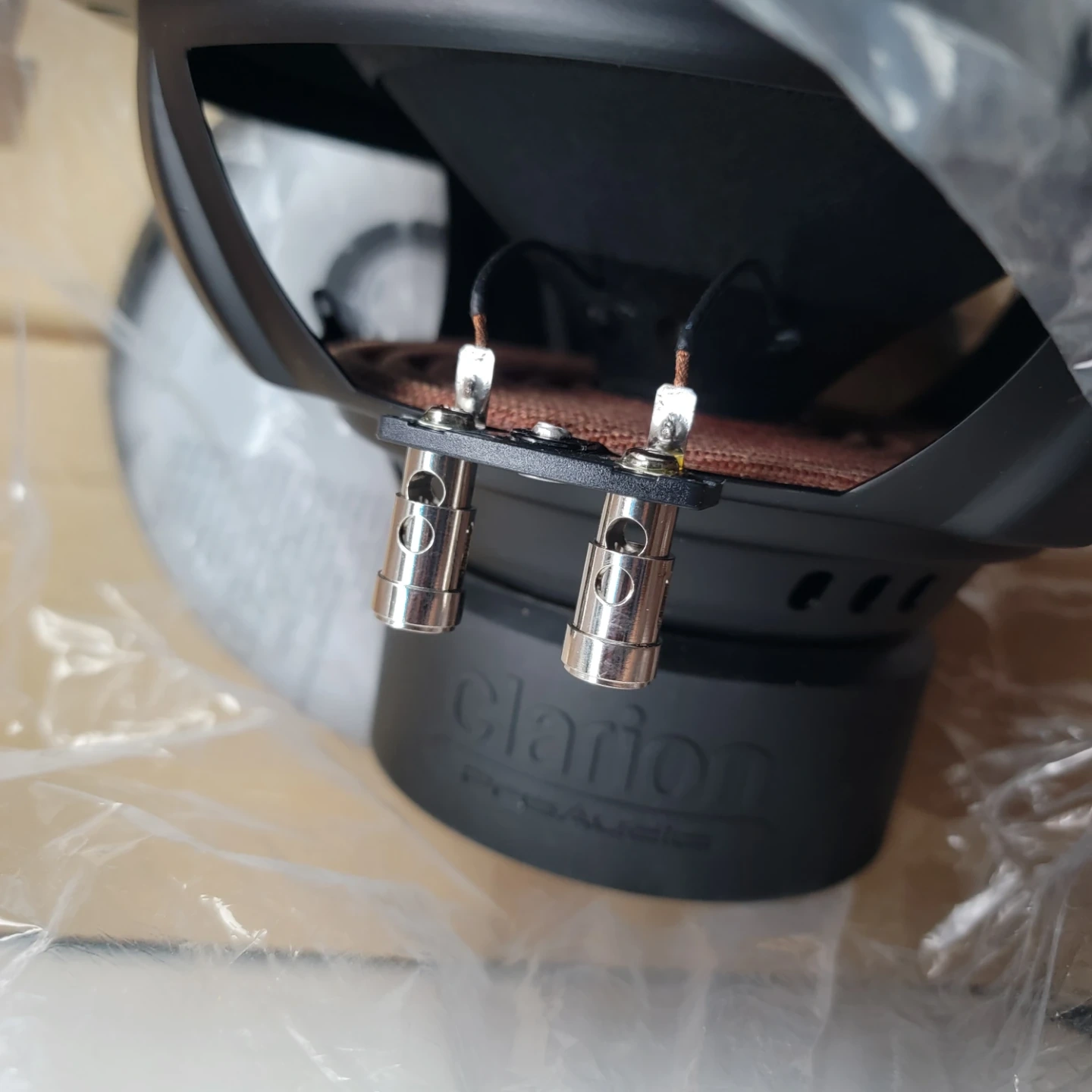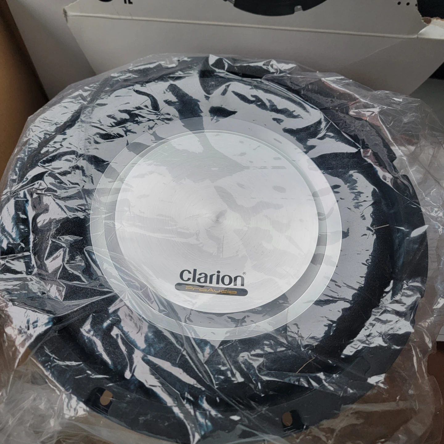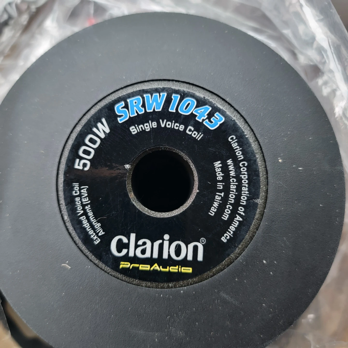 Clarion 10-inch subwoofer with 500W peak music power. Features a polypropylene cone and single voice coil. It has a large strontium ferrite dual magnet and rubber magnet cover. Includes chrome push-in terminals.
