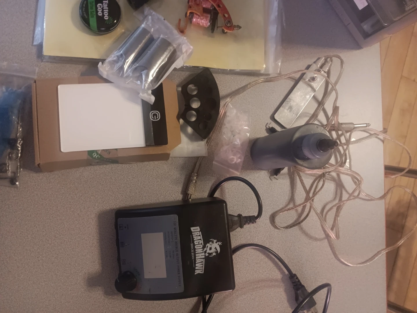 This kit includes a Dragonhawk tattoo power supply, two tattoo guns, several cartridges, and 1 Tattoo Goo balm. It's suitable for tattoo artists starting out or for practice. All items shown are included in this bundle.