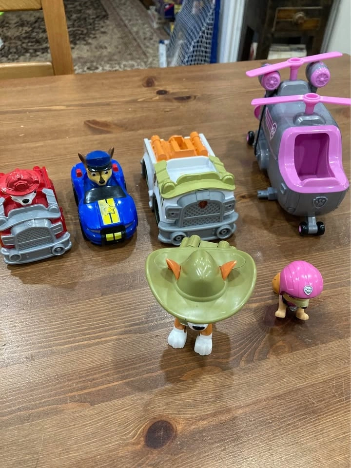 PAW Patrol toy lot in good used condition featuring multiple vehicles and characters. Great for imaginative play or adding to a PAW Patrol collection.