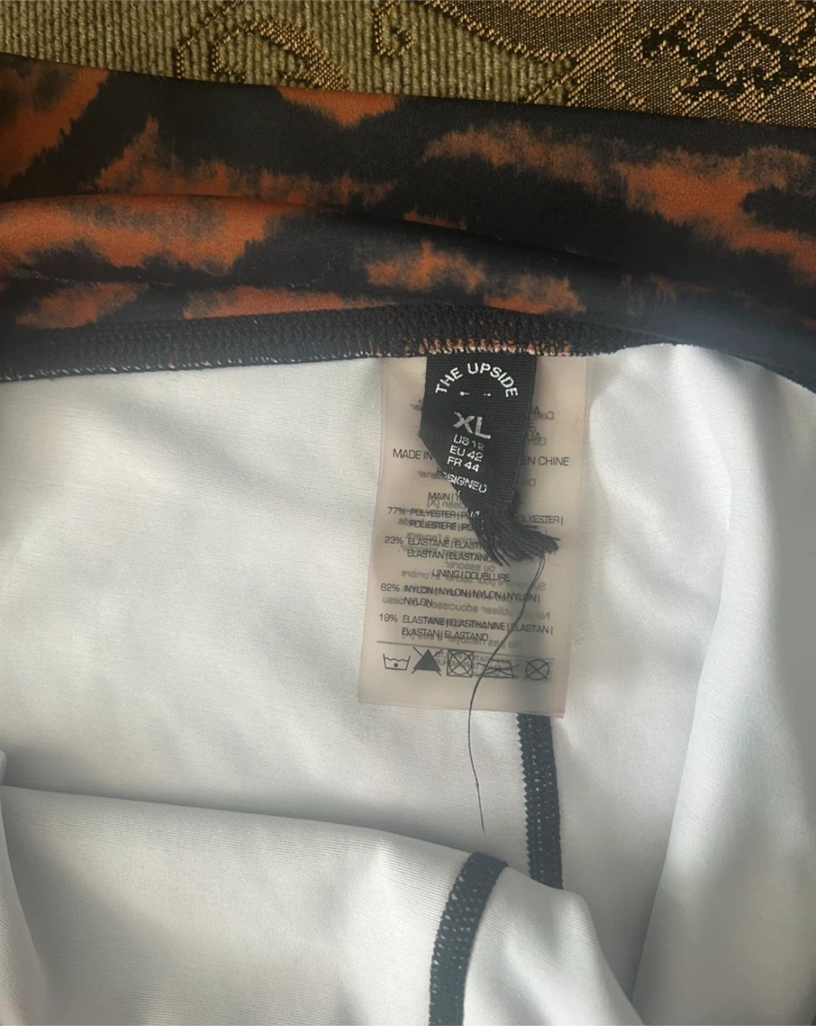 These bike shorts from The Upside feature a cool tiger print! They are a size XL and made of a comfy blend of nylon and elastane.