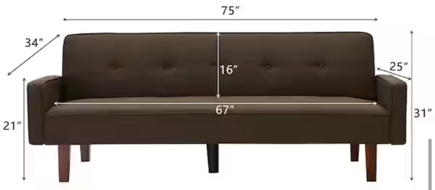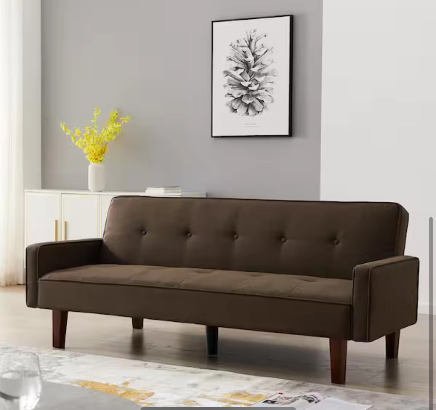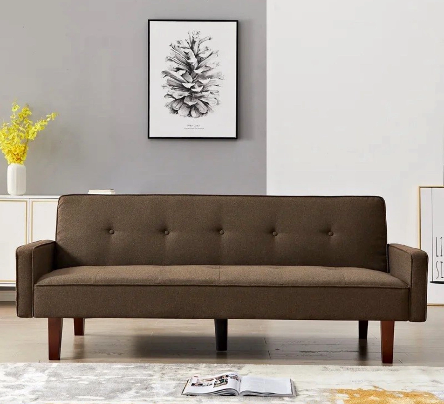 Comfortable and stylish futon sofa bed. Brown fabric upholstery. Wooden legs. Pull-out bed functionality. Perfect for small spaces. Almost brand new. For dimension, please check the last image.