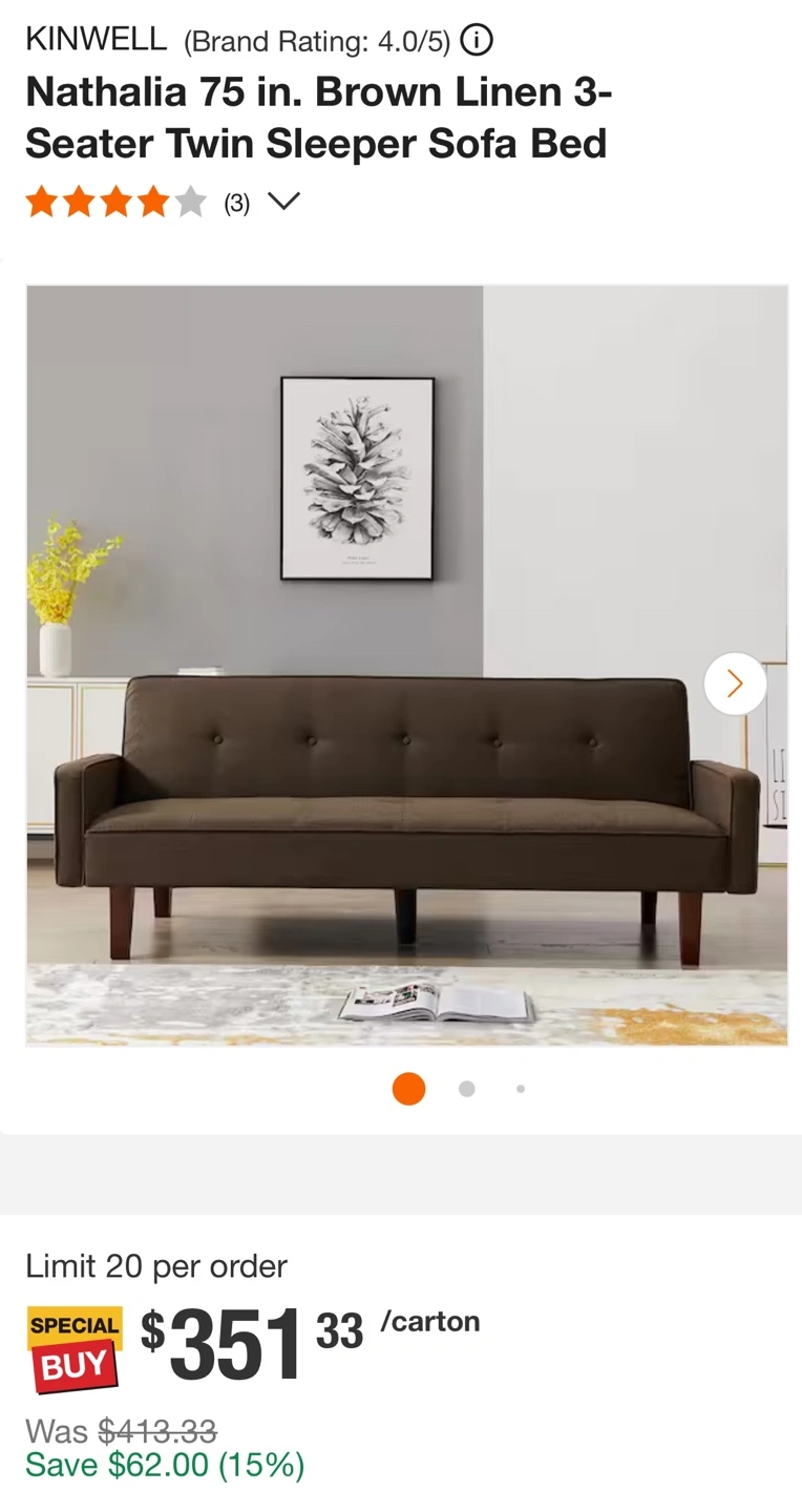 Nathalia 75 in. Brown Linen 3-Seater Twin Sleeper Sofa Bed