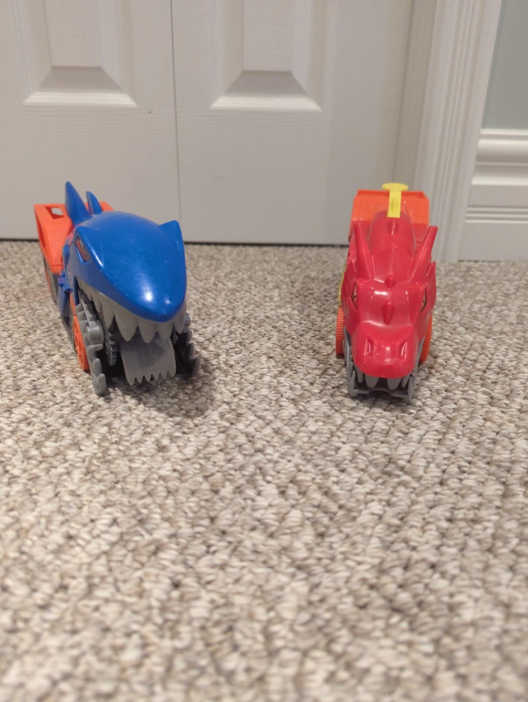 Selling a pair of Hot Wheels cars! One is a Sharkruiser (blue and orange) and the other is a Dragon Blaster (red and orange). They're in good condition and ready for a new adventure!