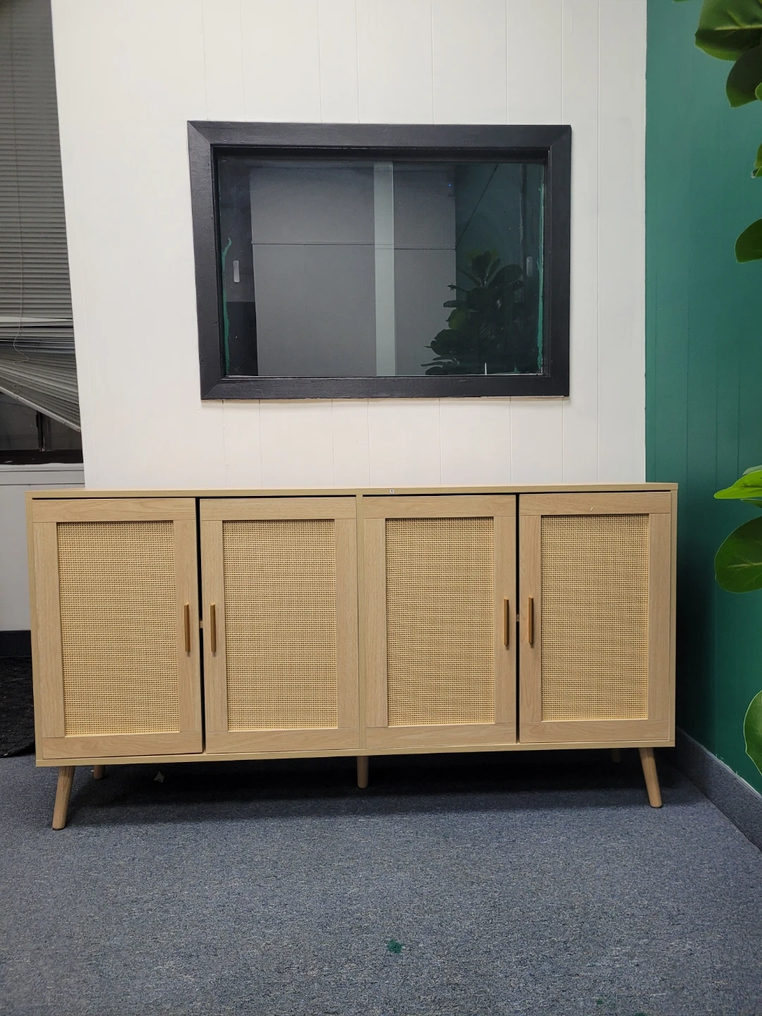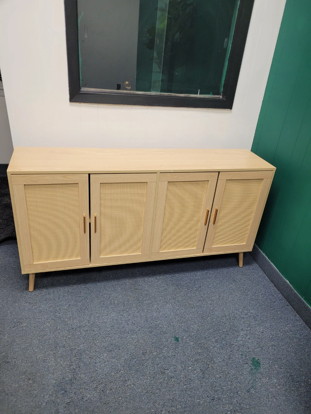 Four-door sideboard with cane detailing and light wood finish. It features two shelves inside for storage. A stylish piece for any living or dining area!