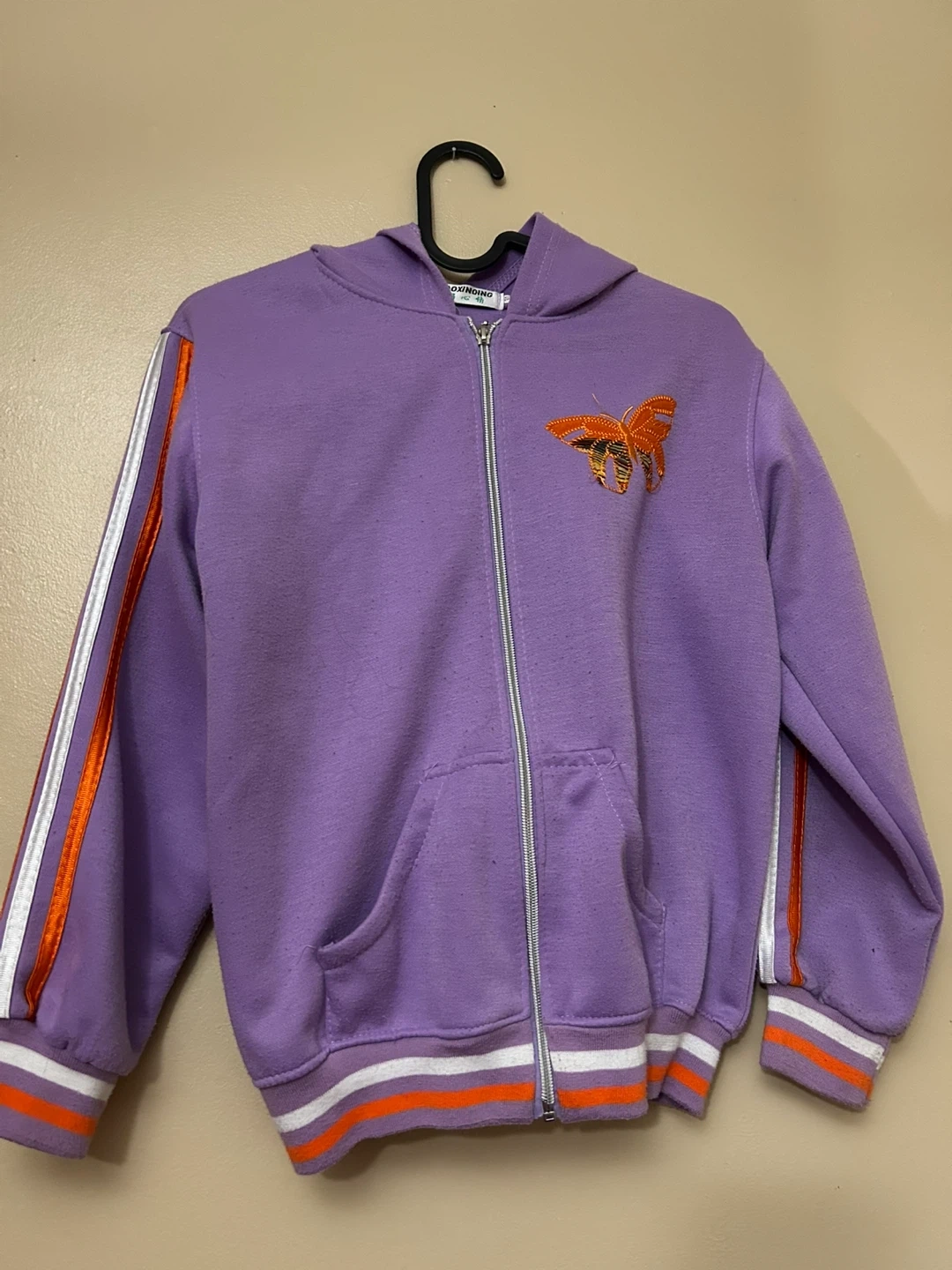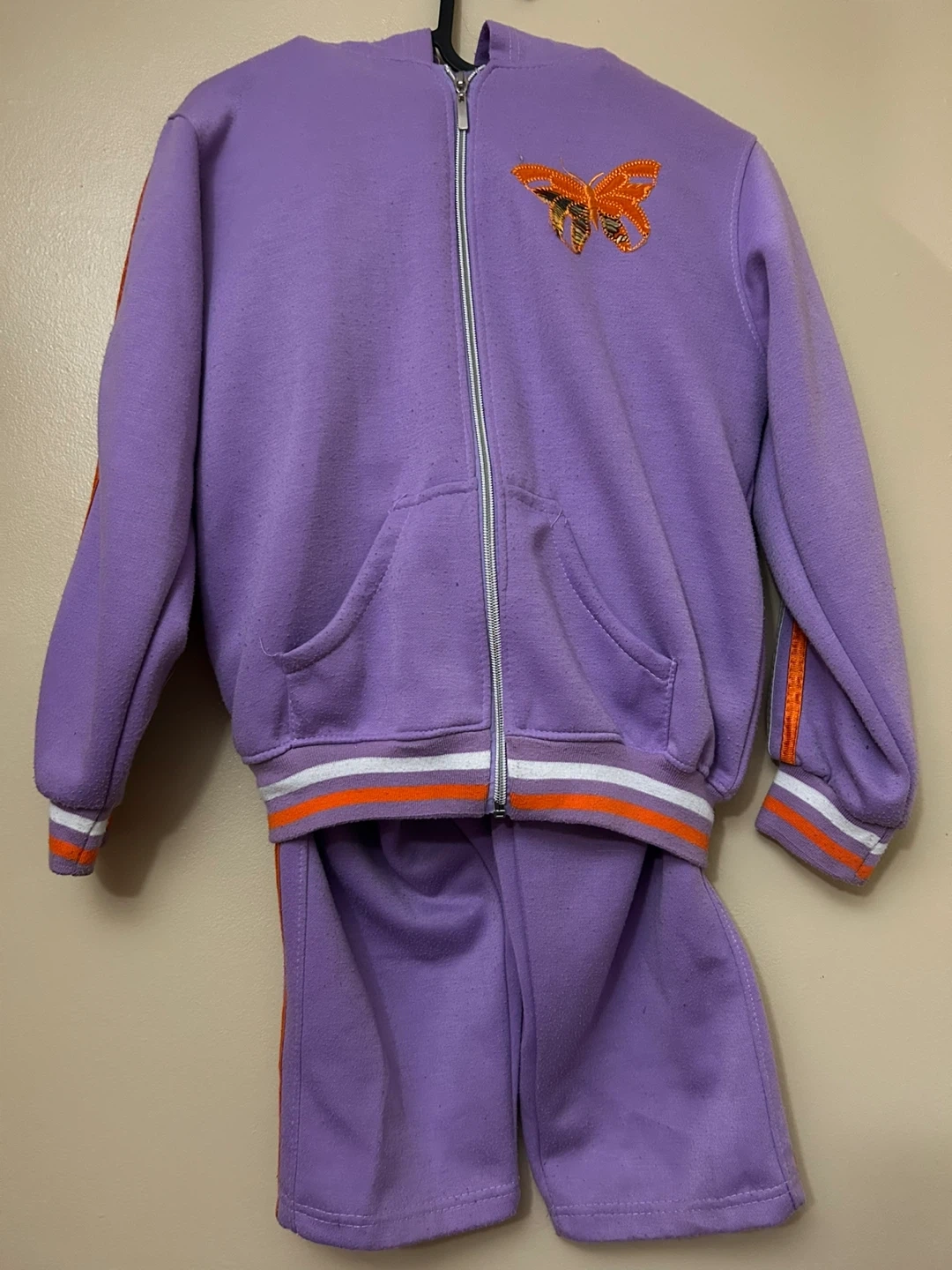 This adorable purple 2-piece track suit is perfect for your stylish kid, featuring a zip-up jacket and matching shorts, adorned with a cute butterfly design. This item is in used condition, but still has lots of life left!