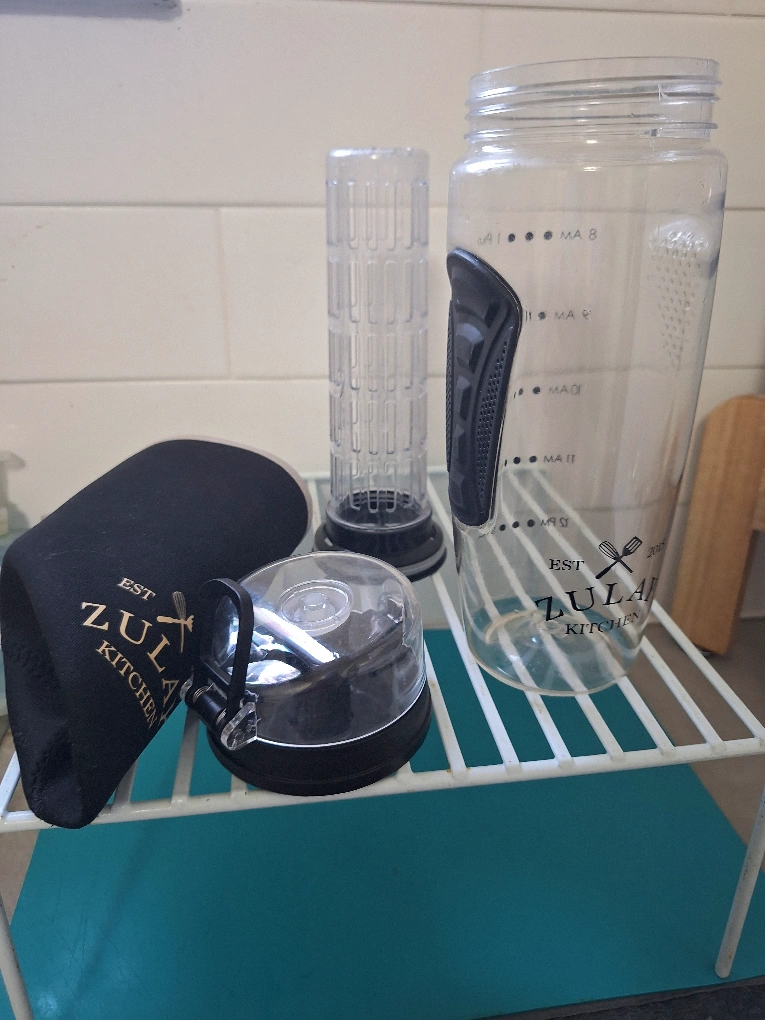 Looking to add some flavour to your water? This Zulay Kitchen fruit infusion water bottle is perfect for you and in perfect clean condition.It comes with the infuser, bottle, and sleeve. The original price was $59.25.it is 34 oz capacity with a bottle cover.leak proof and shatter proof design.pick up deer park crescent st clair toronto