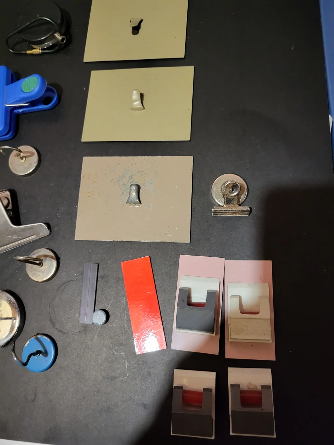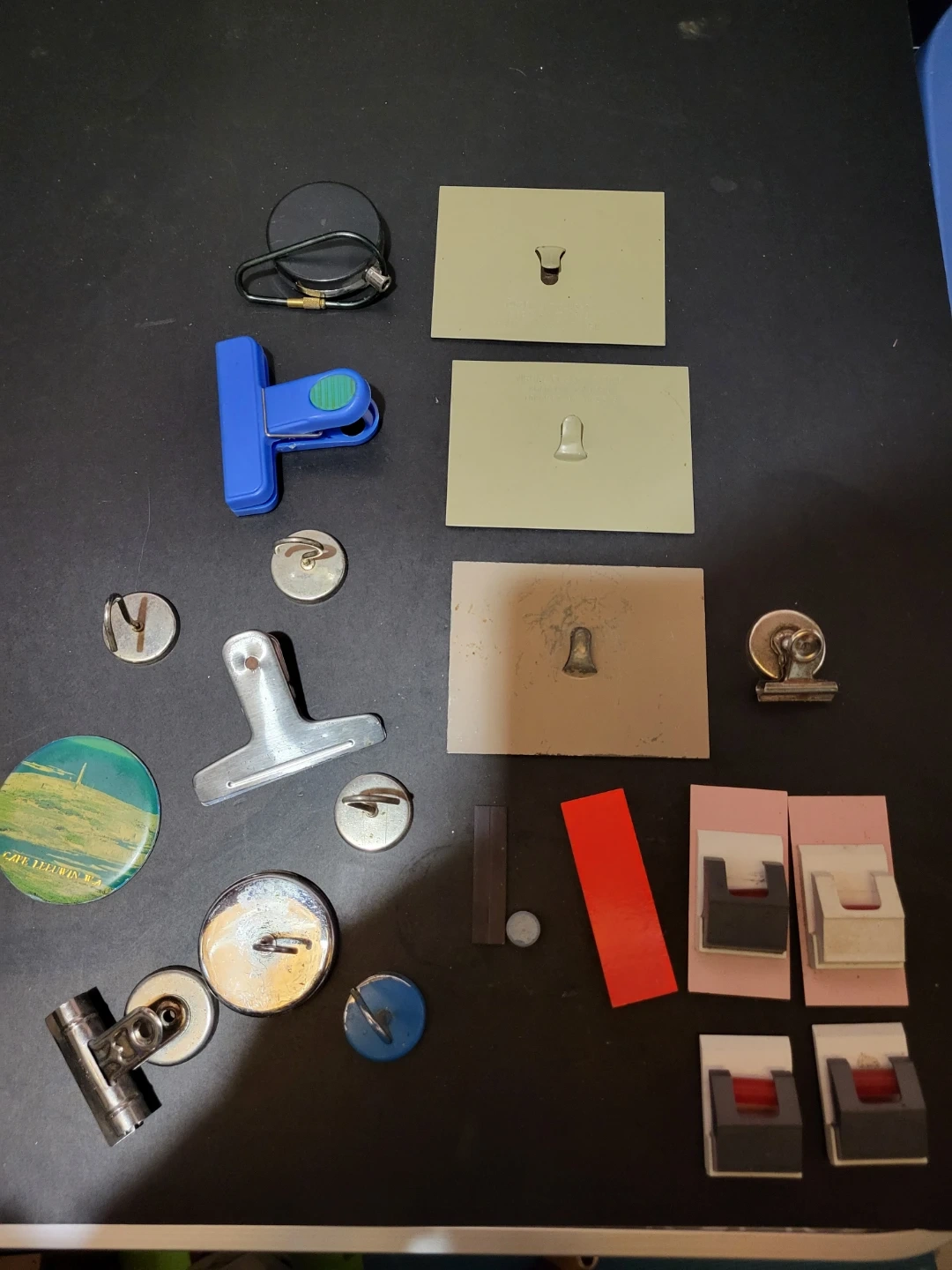 A collection of various office and crafting supplies, including binder clips, round magnets, and small fasteners. Includes several metal binder clips, a blue plastic clip, and numerous small magnets in different sizes and colours. Also present are flat beige square mounting pieces with clips, and some smaller rectangular red and grey strips. These are useful for organizing papers, attaching items to magnetic surfaces, or for crafting projects. What you see is what's available.