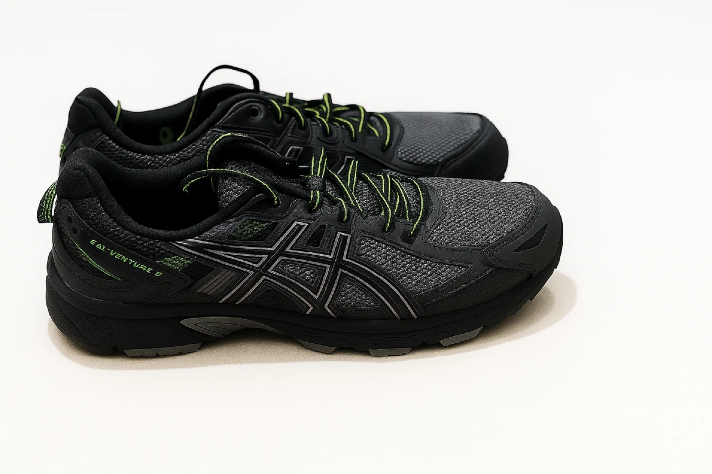 ASICS Gel-Venture 6 trail running shoes in black and Green. Mesh upper with lace-up closure. Durable rubber outsole with good traction. These shoes are ready for your next adventure!