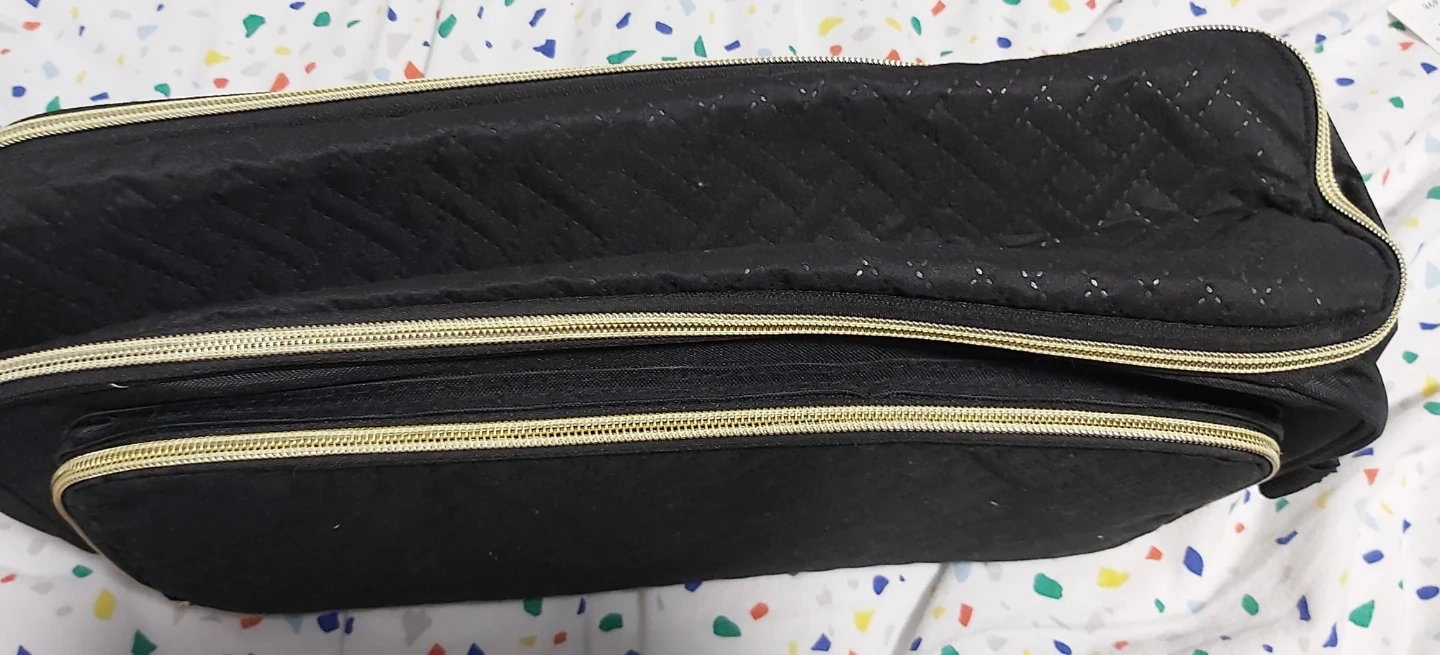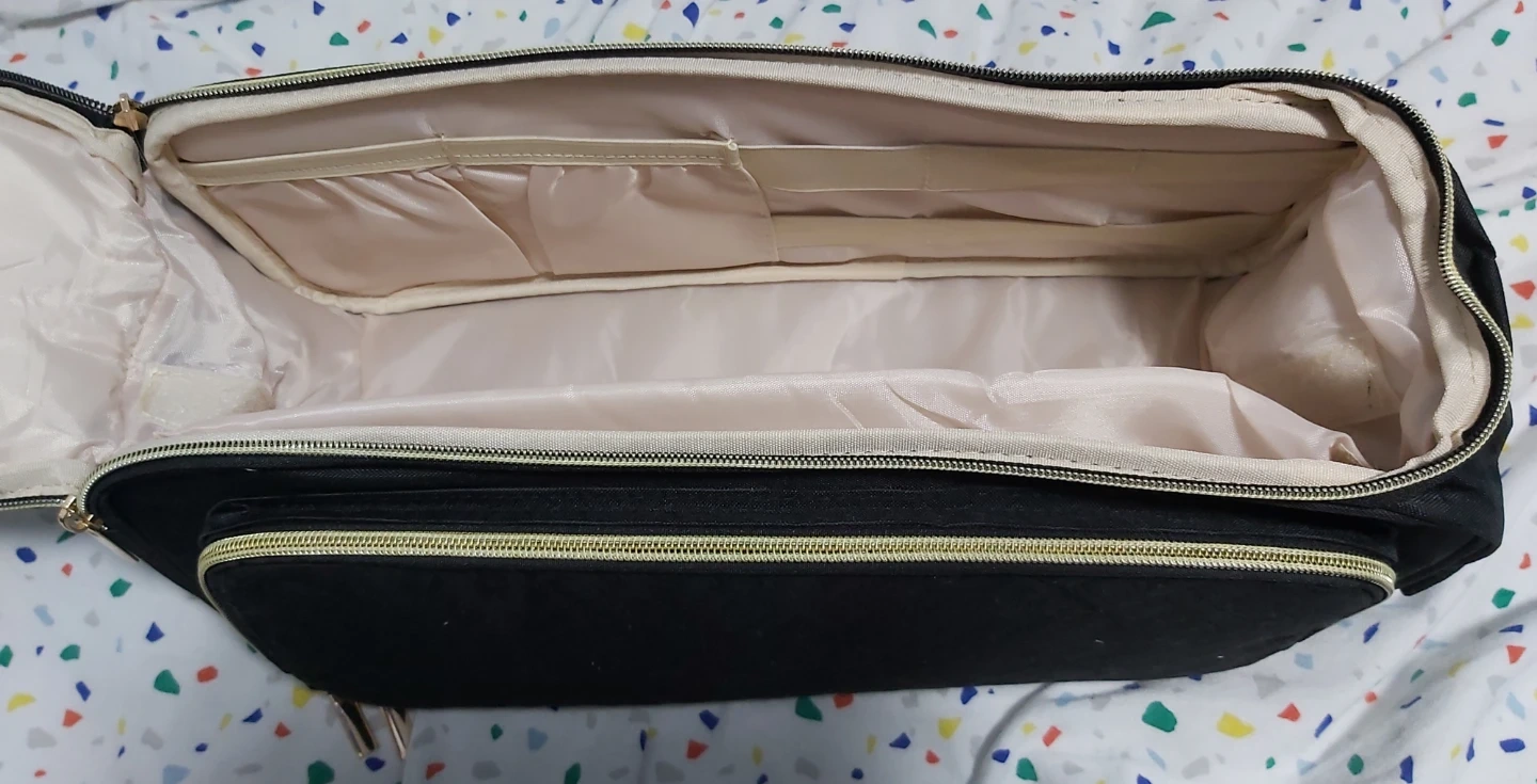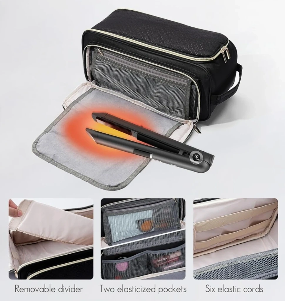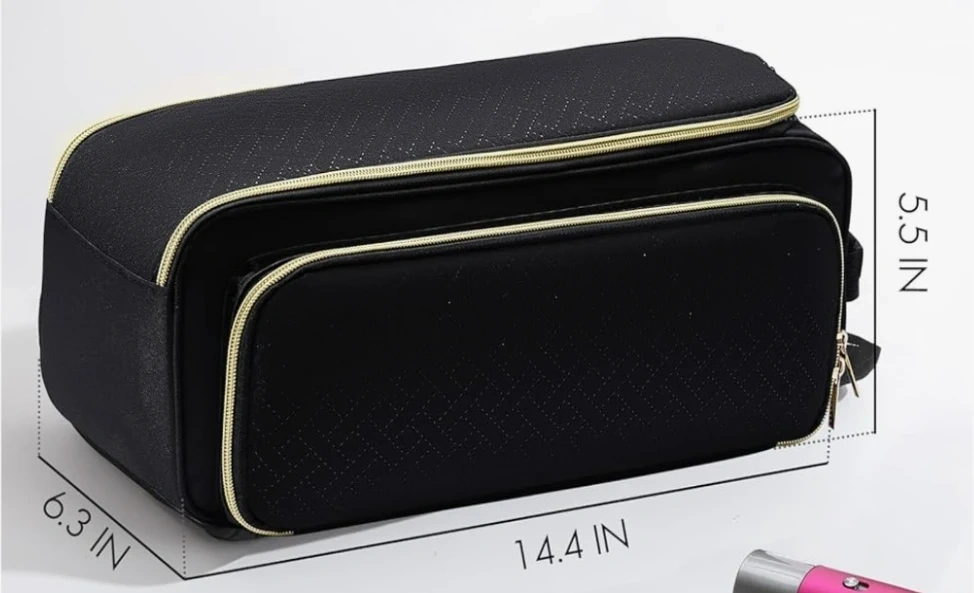 This black toiletry bag organizer is great for travel. It features multiple compartments inside for easy organization.