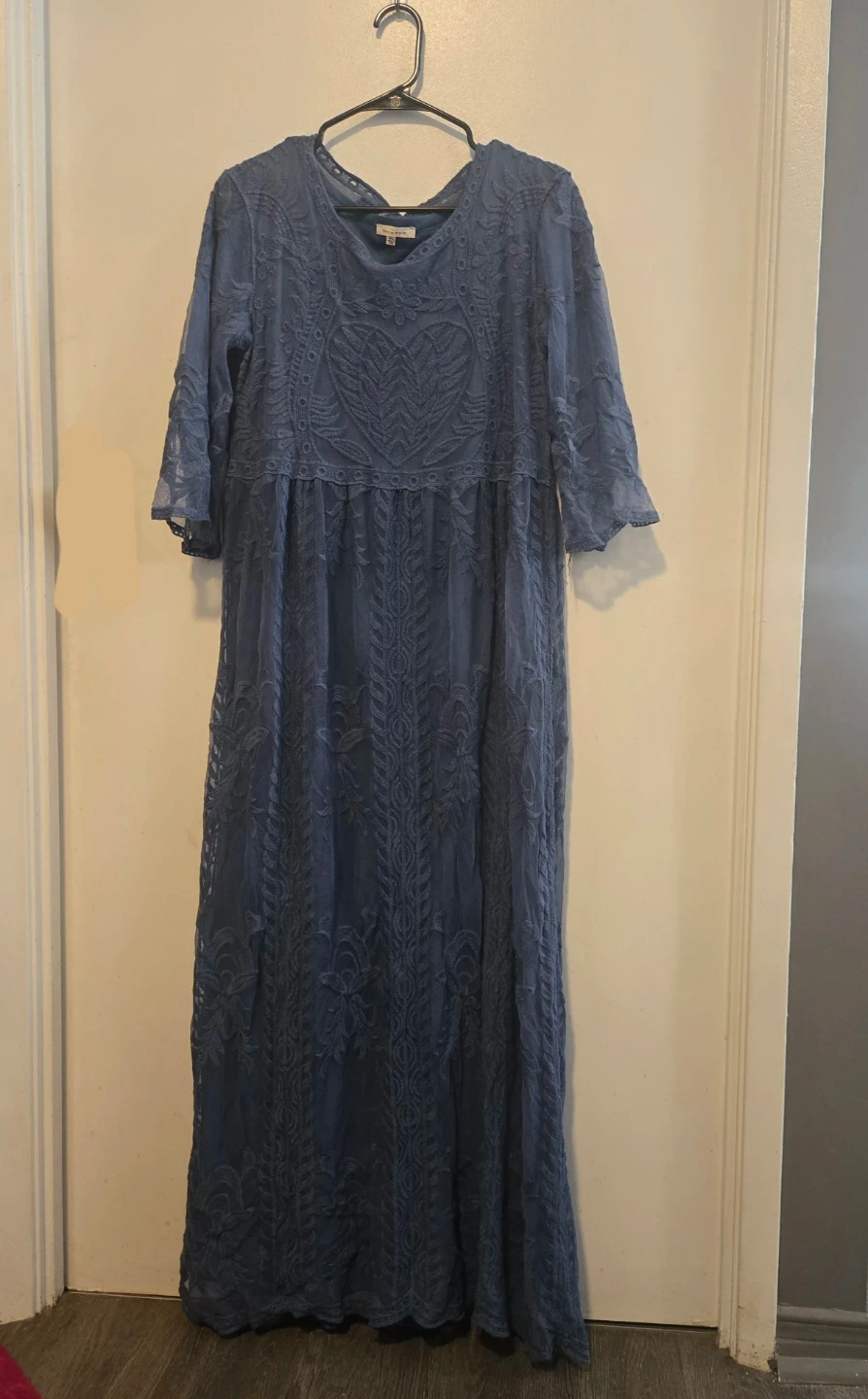 Beautiful blue lace maxi dress with 3/4 sleeves. Features an intricate lace overlay design with floral and heart embroidery. Perfect for special occasions or a stylish everyday look!
