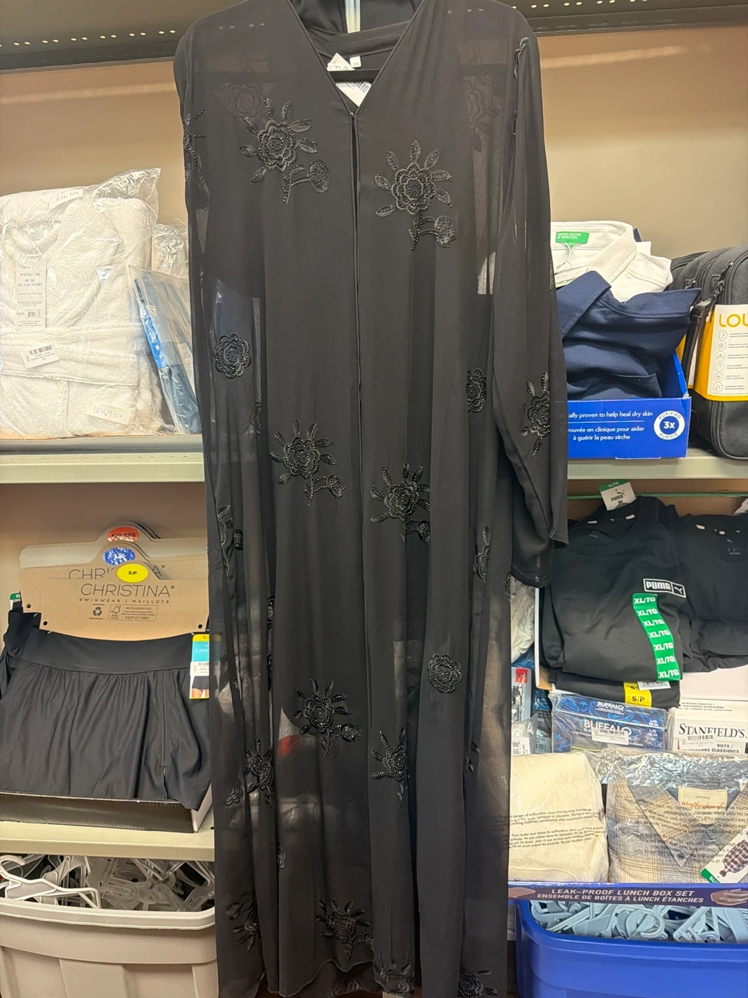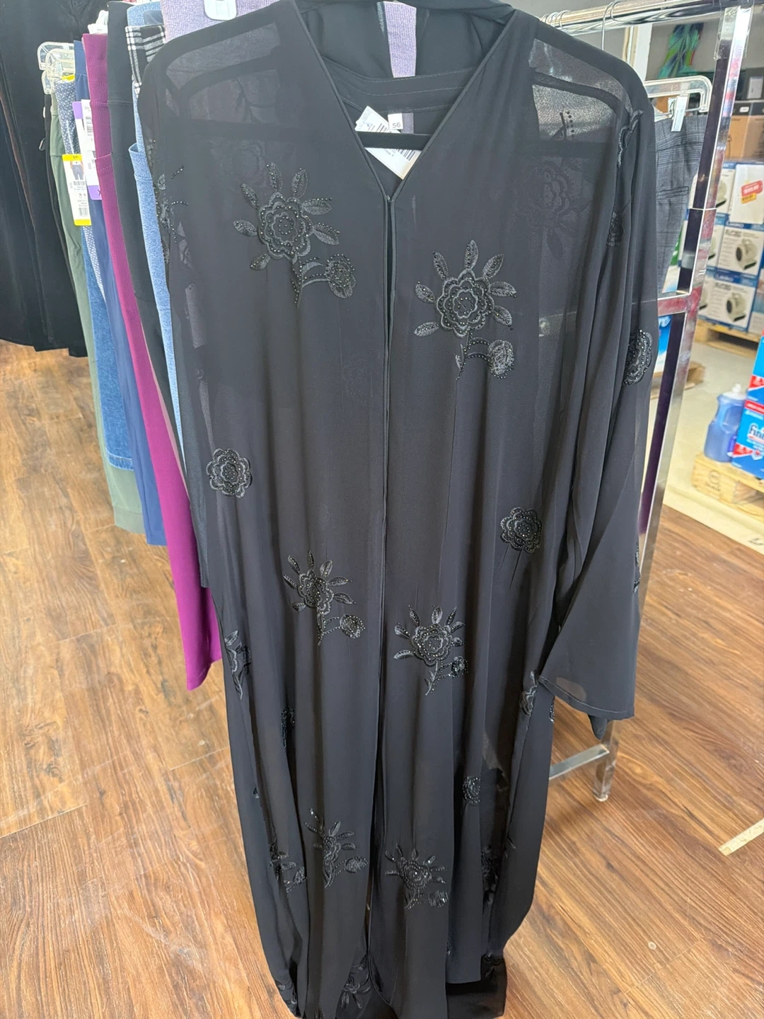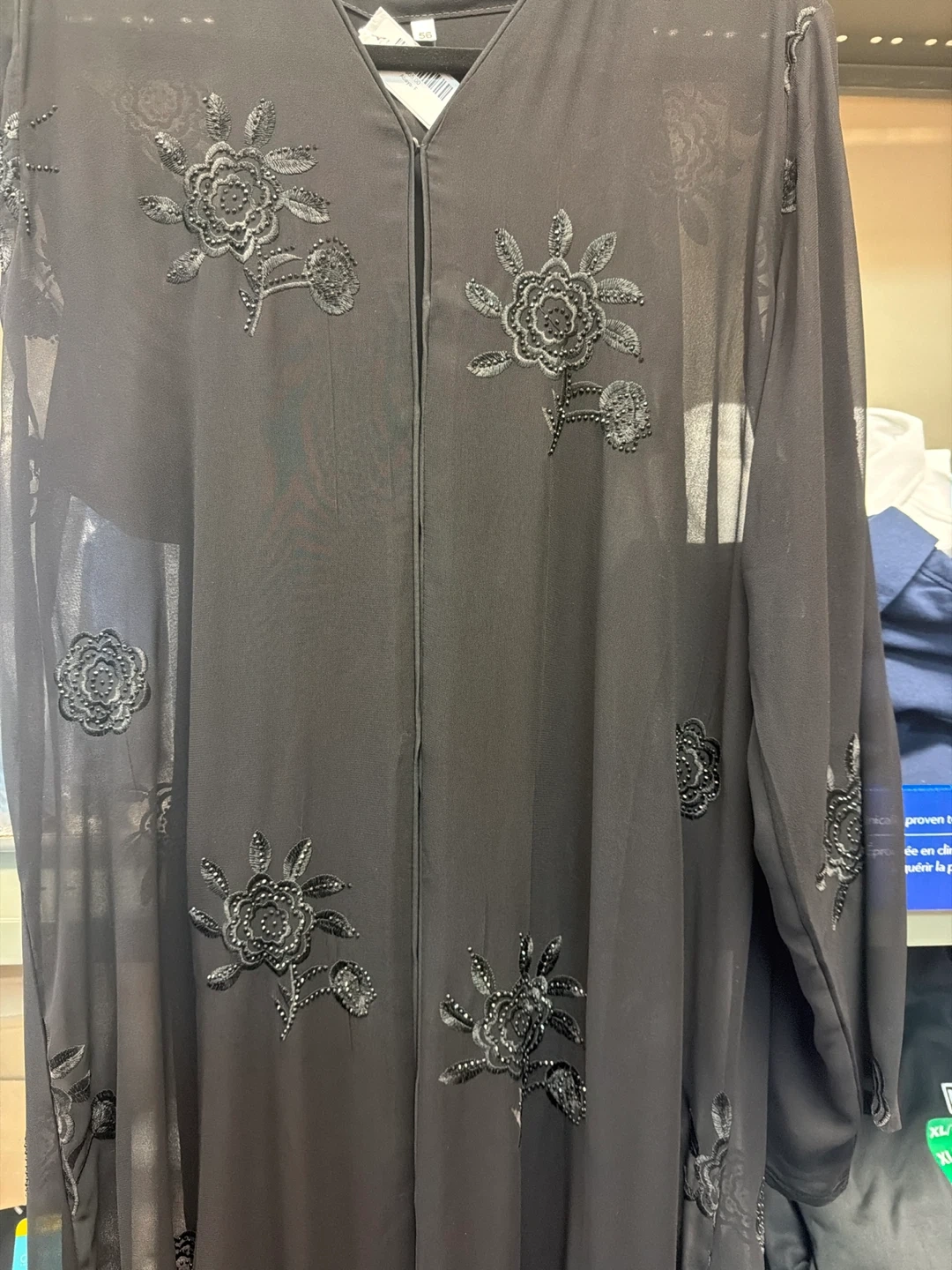 This is a beautiful black abaya made from a sheer material. It's adorned with intricate embroidered floral designs all over. It offers a lightweight and elegant feel.Size 56 available made in UAE