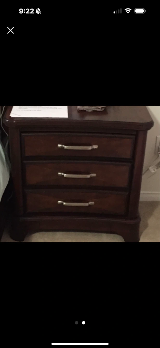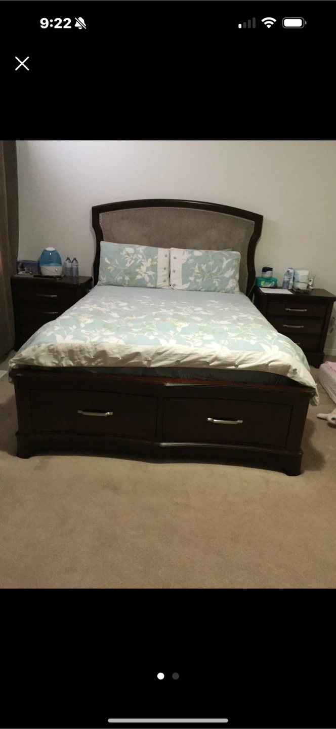 This bedroom set includes a queen-size bed frame with built-in storage drawers and a matching dark wood nightstand. The bed frame features a upholstered headboard and ample under-bed storage. The nightstand has three drawers for convenience. Dark wood finish. Ashly furniture.