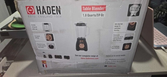 Brand new, unopened box. Haden Blender with Glass Jar. I bought it to match my decor of black and rose gold but never used it. I originally paid $200 for it.